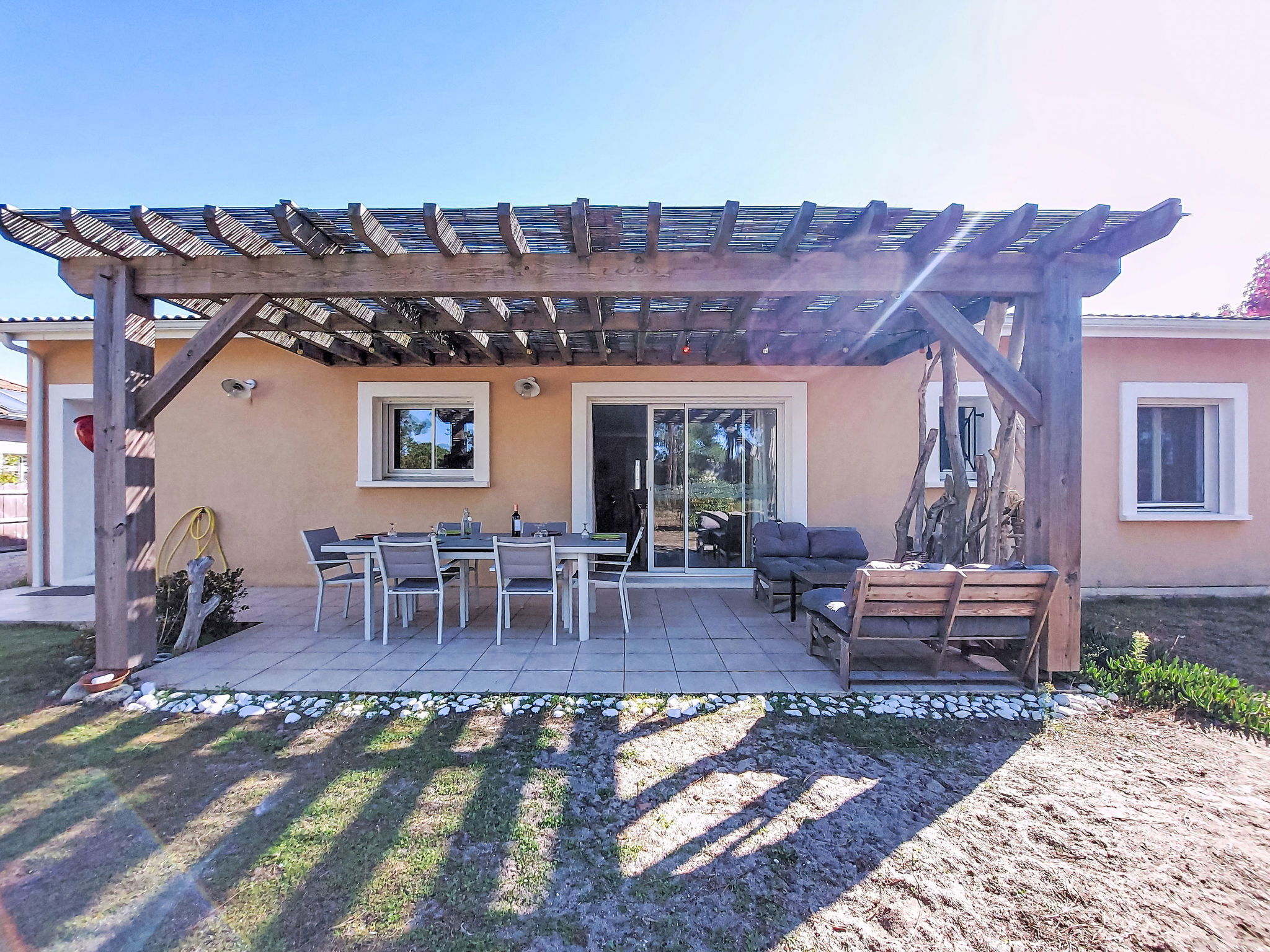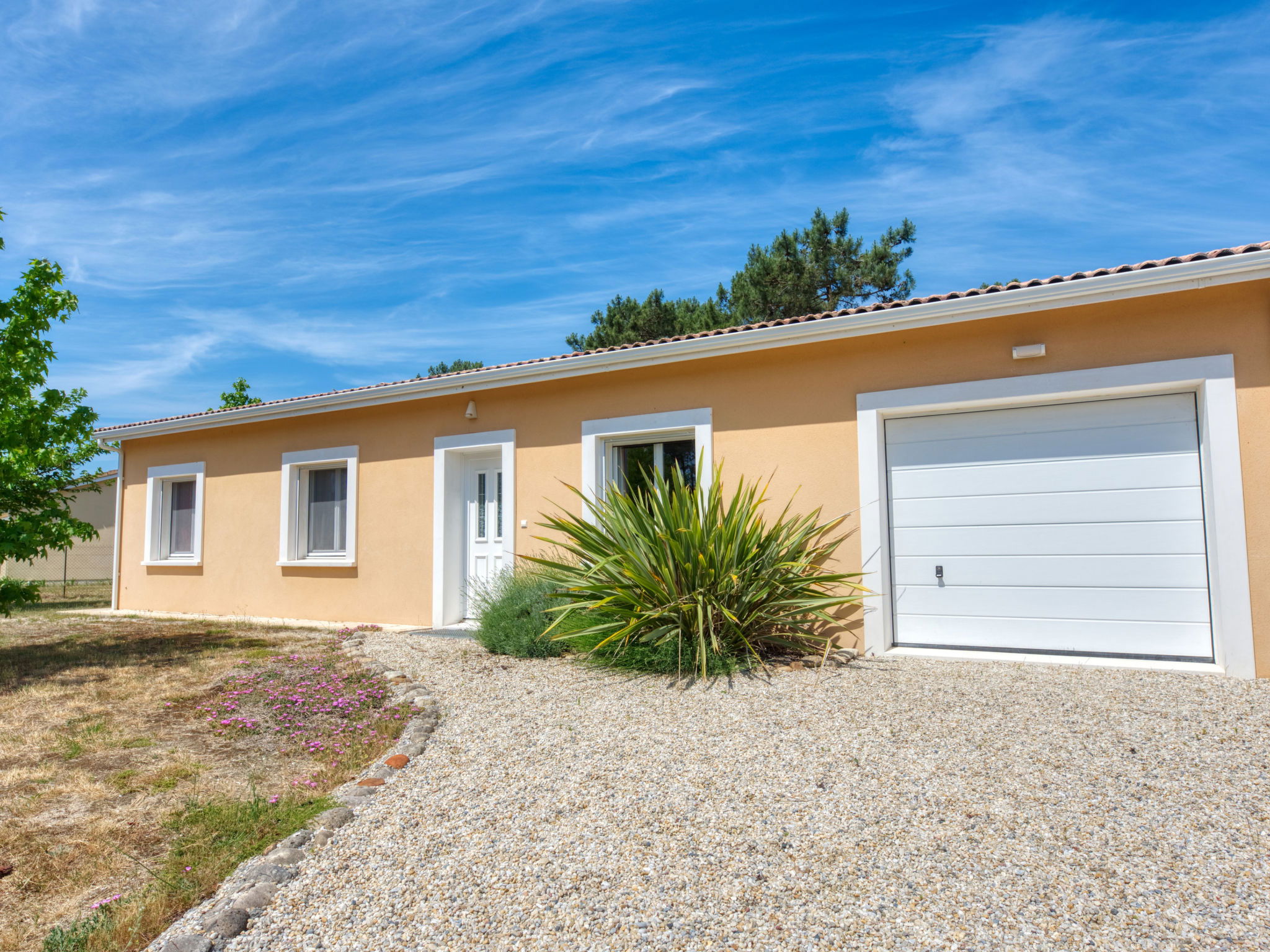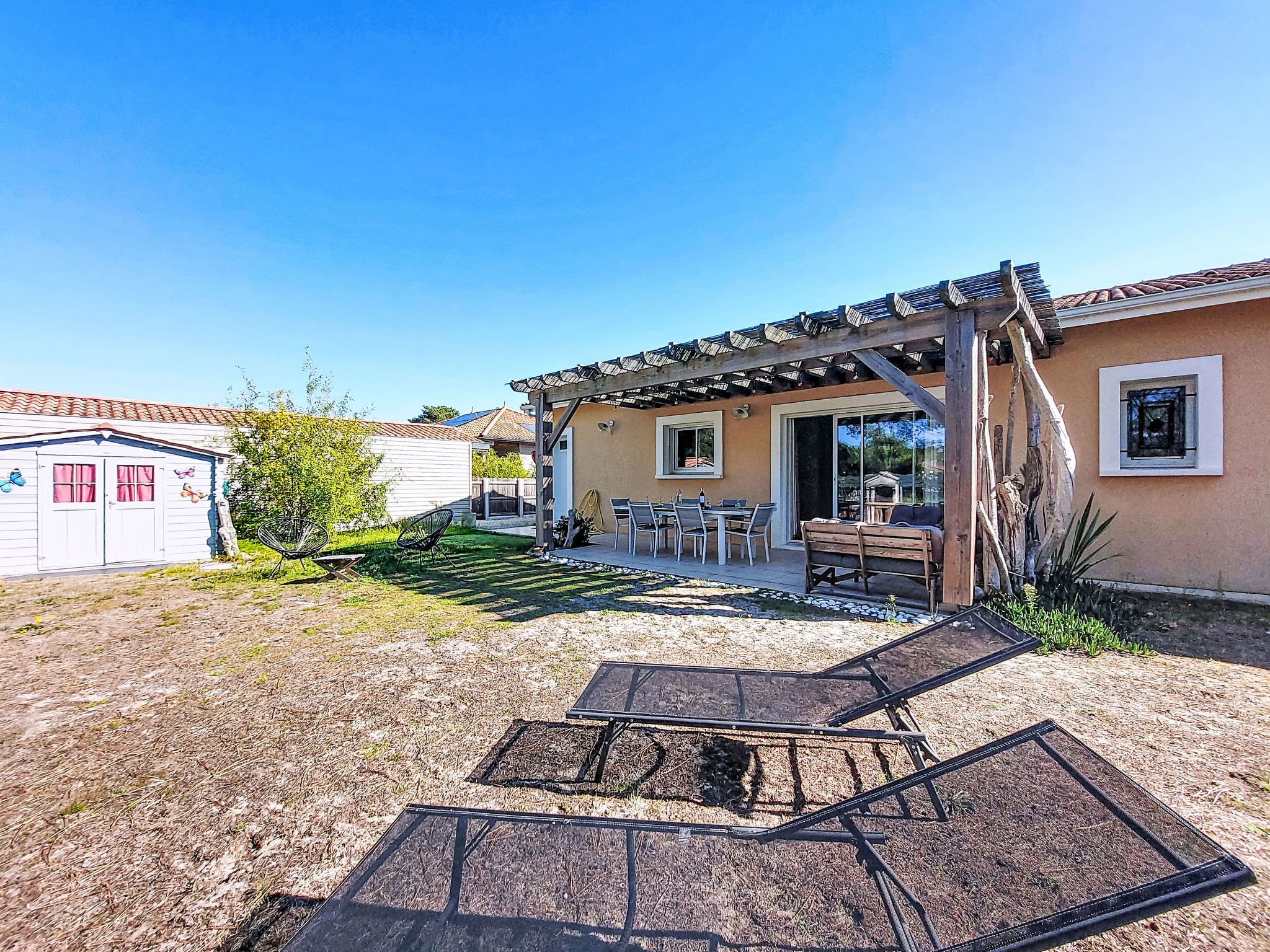 Single-family house "Les Ormes", built in 2012. 1.5 km from the centre of Montalivet, 21 km from the centre of Lesparre, 85 km from the centre of Bordeaux, in the residential district, 1.5 km from the sea. Private: natural state property 800 m2 (fenced) with trees. Pergola, parking (for 2 cars) at the house on the premises. Supermarket 1.5 km, bus stop "Av. De l'Europe/Montalivet" 800 m, sandy beach "Montalivet" 1.5 km.