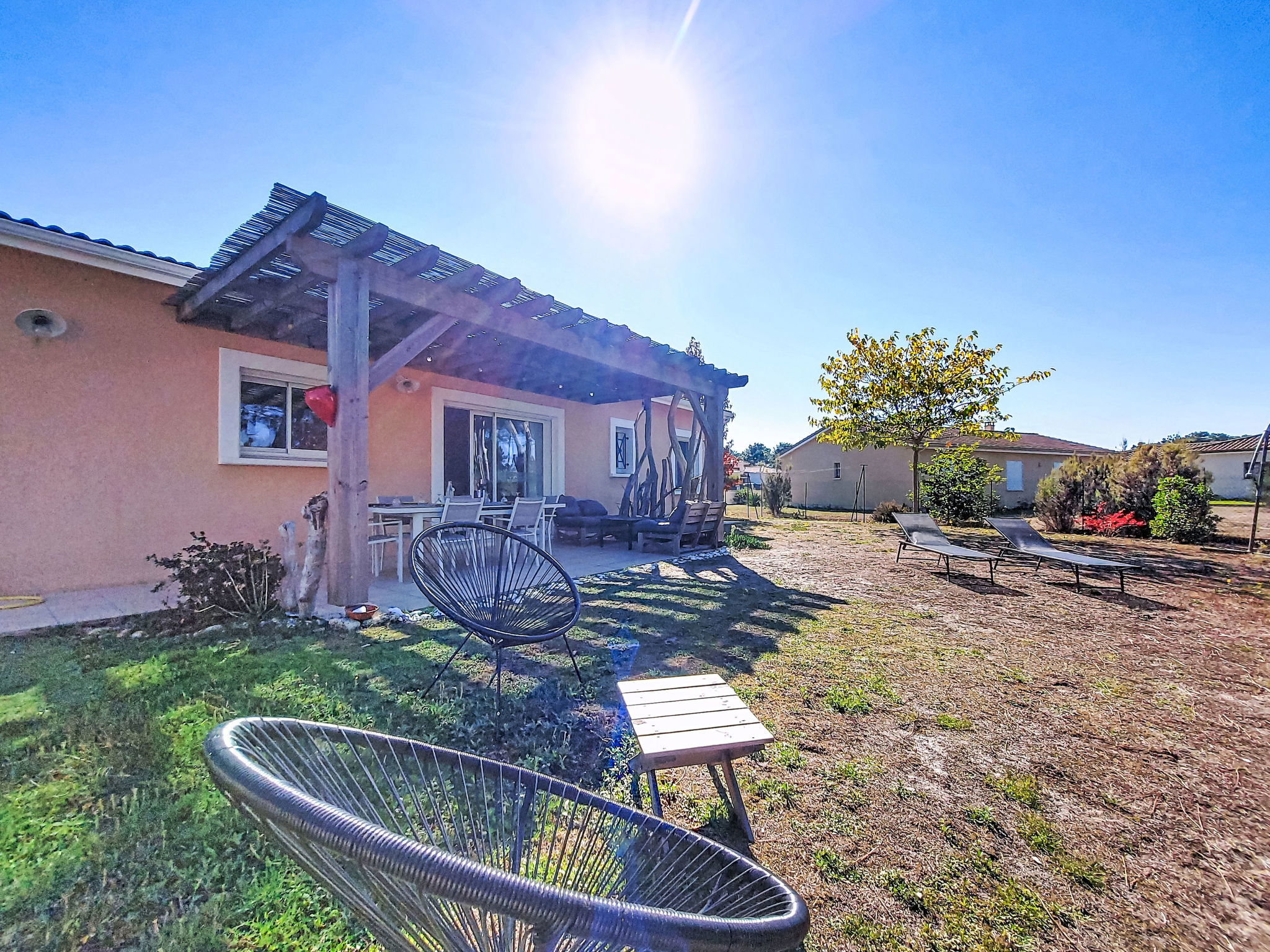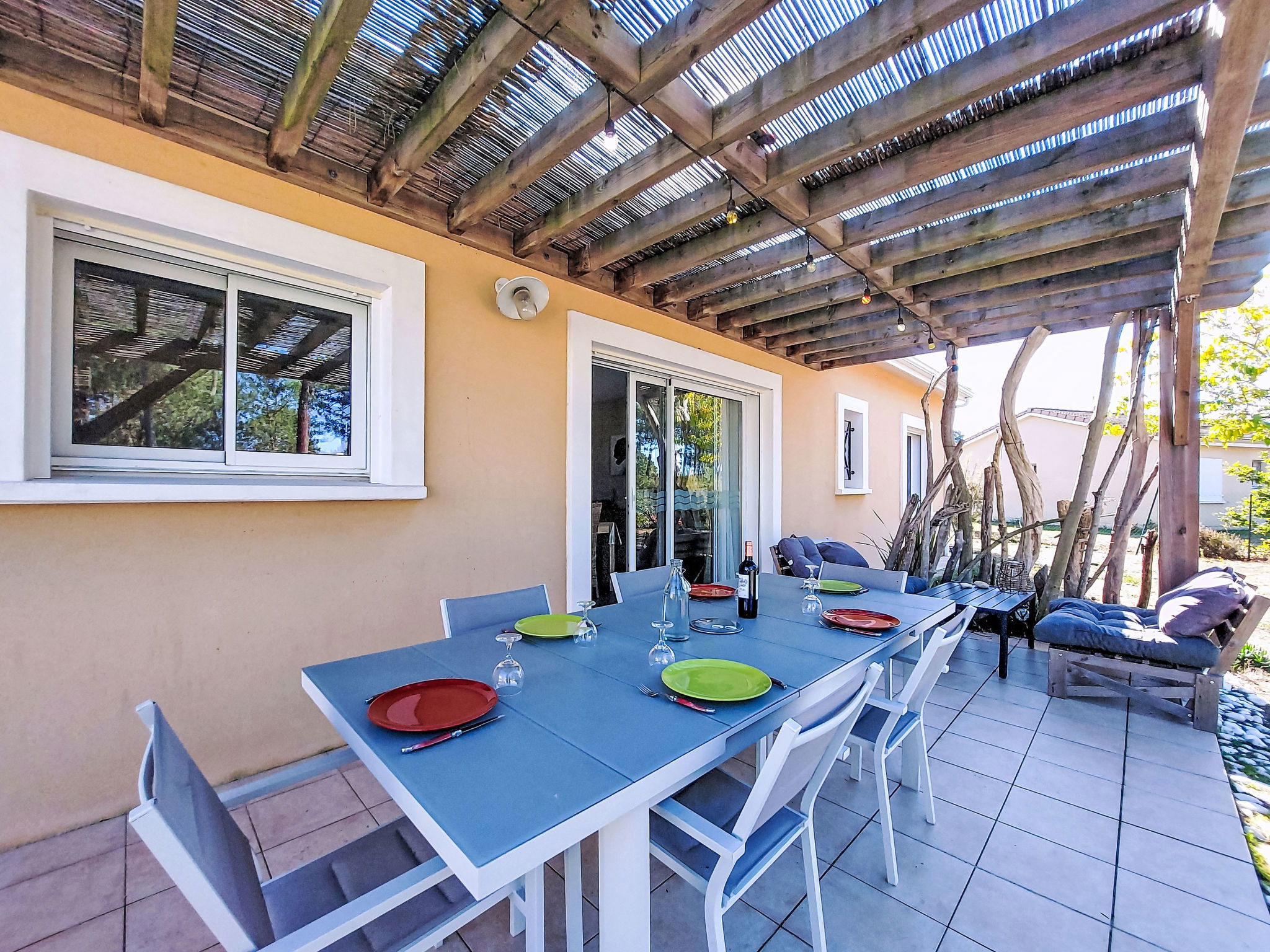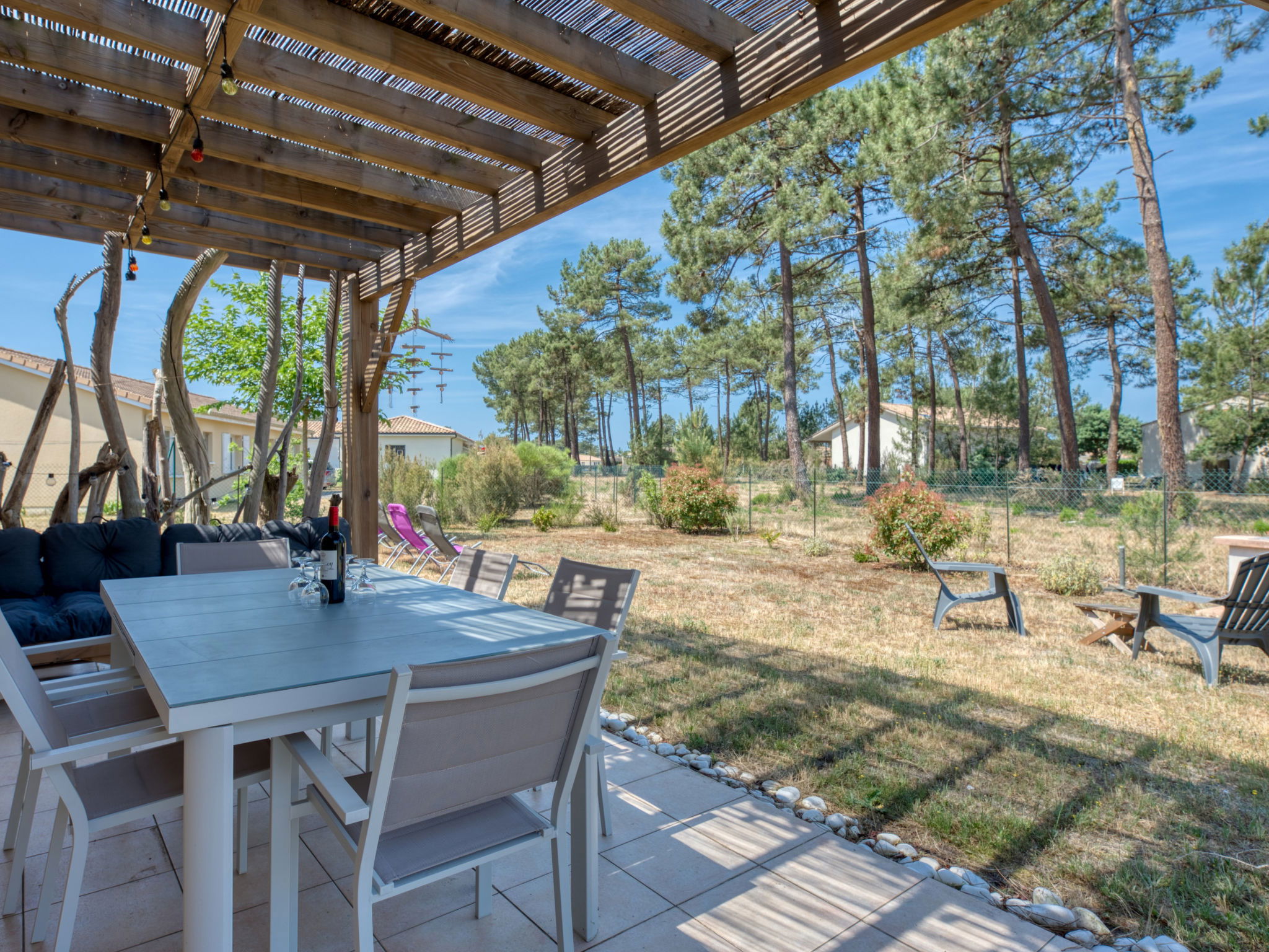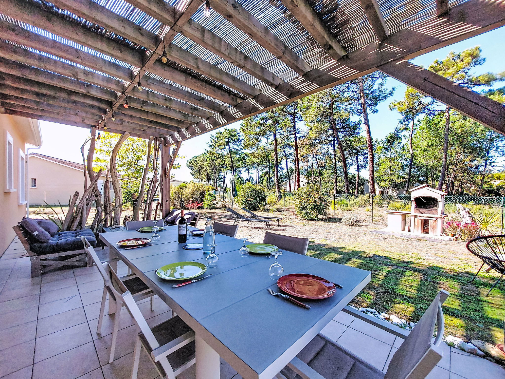 Single-family house "Les Ormes", built in 2012. 1.5 km from the centre of Montalivet, 21 km from the centre of Lesparre, 85 km from the centre of Bordeaux, in the residential district, 1.5 km from the sea. Private: natural state property 800 m2 (fenced) with trees. Pergola, parking (for 2 cars) at the house on the premises. Supermarket 1.5 km, bus stop "Av. De l'Europe/Montalivet" 800 m, sandy beach "Montalivet" 1.5 km.