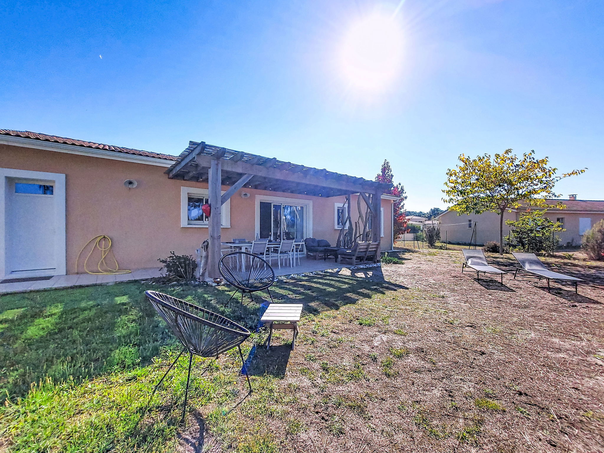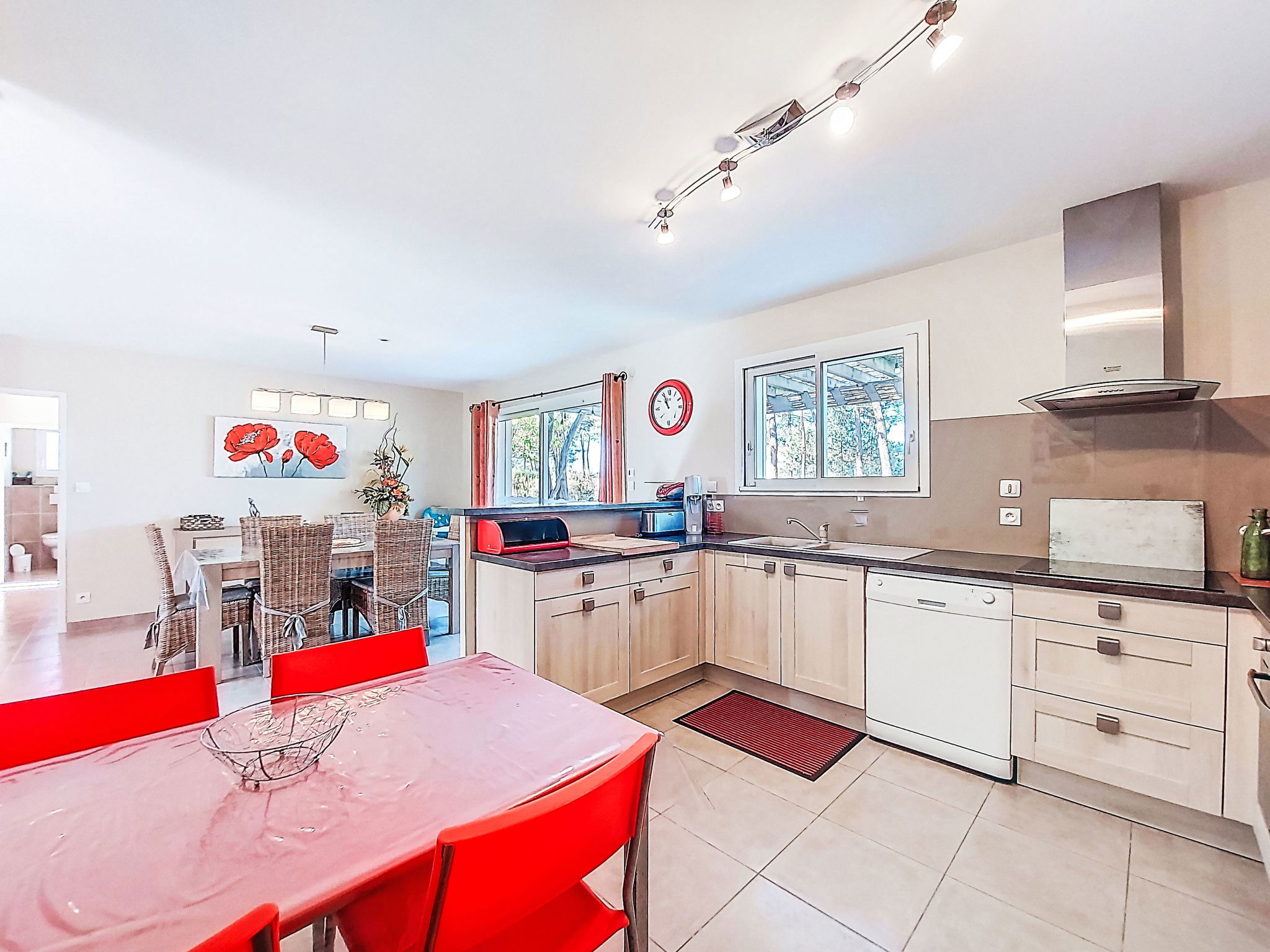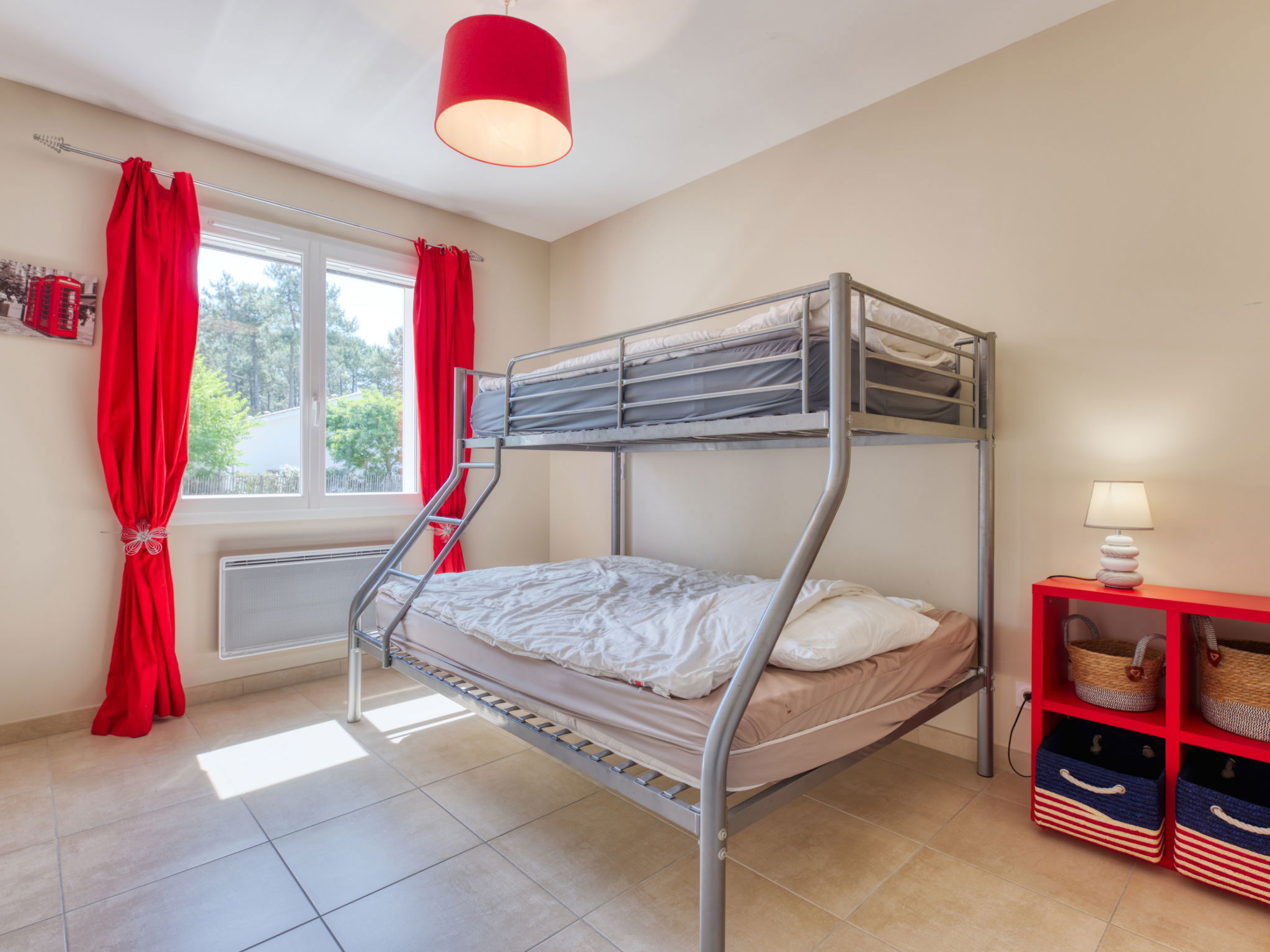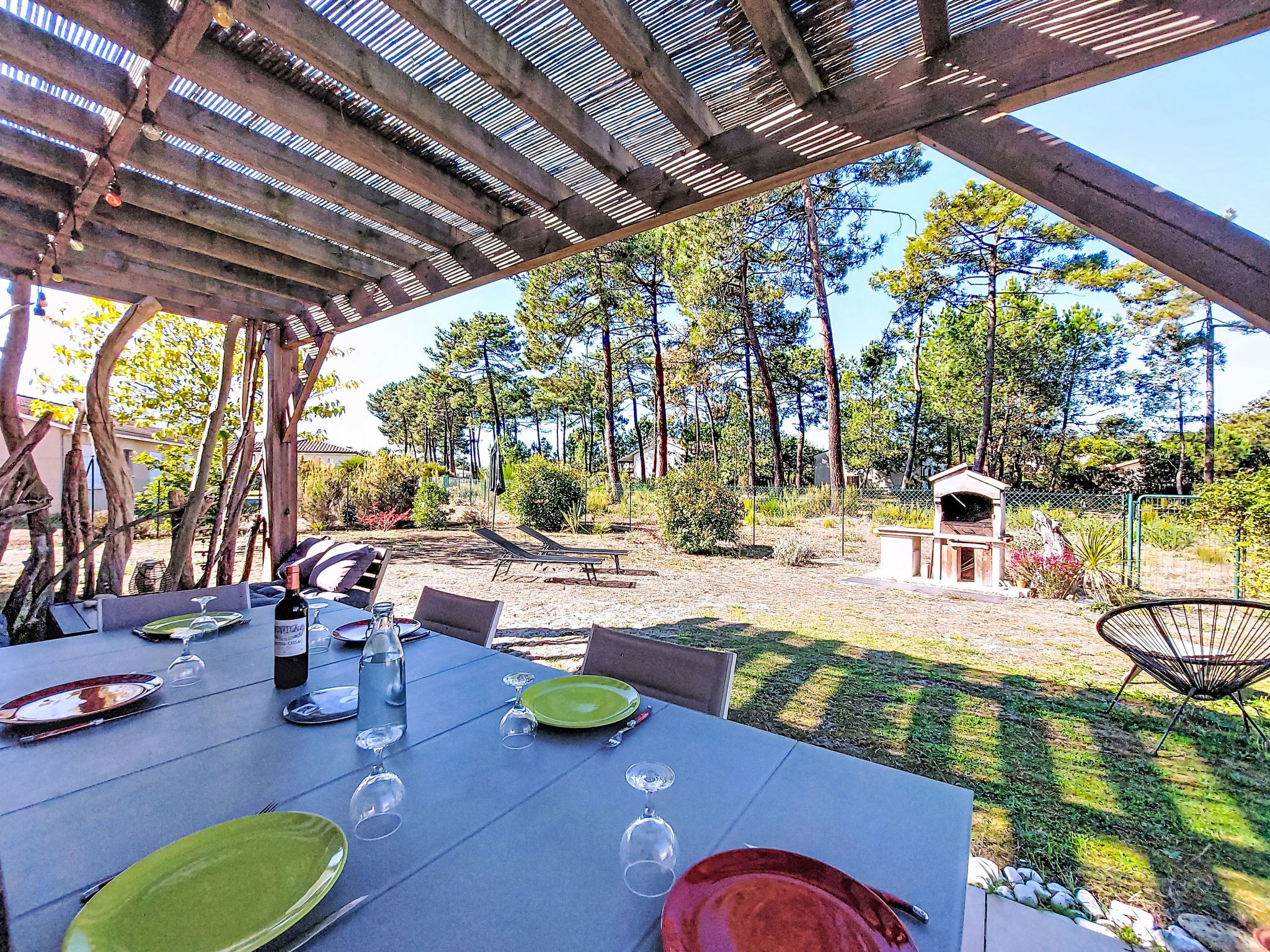 "Les Ormes", 4-room house 110 m2. Bright, comfortable furnishings: living/dining room with dining table and satellite TV (flat screen), radio, CD-player and DVD. Exit to the terrace. 2 rooms, each room with 1 french bed (140 cm, length 190 cm). 1 room with 1 x 1 bunk beds (90 cm, length 190 cm), 1 french bed (140 cm, length 190 cm). Open kitchen (oven, dishwasher, 3 induction hot plates, toaster, kettle, microwave, freezer, electric coffee machine, Capsules for coffee machine (Senséo) extra) with bar. Shower, sep. WC, double hand-basin. Electric heating, air-conditioning. Terrace. Terrace furniture, barbecue, deck chairs (6), box-room. Facilities: washing machine, dryer, iron, children's high chair, baby cot. Internet (WiFi, free). Please note: non-smoking house. Maximum 1 pet/ dog allowed. Smoke alarm.