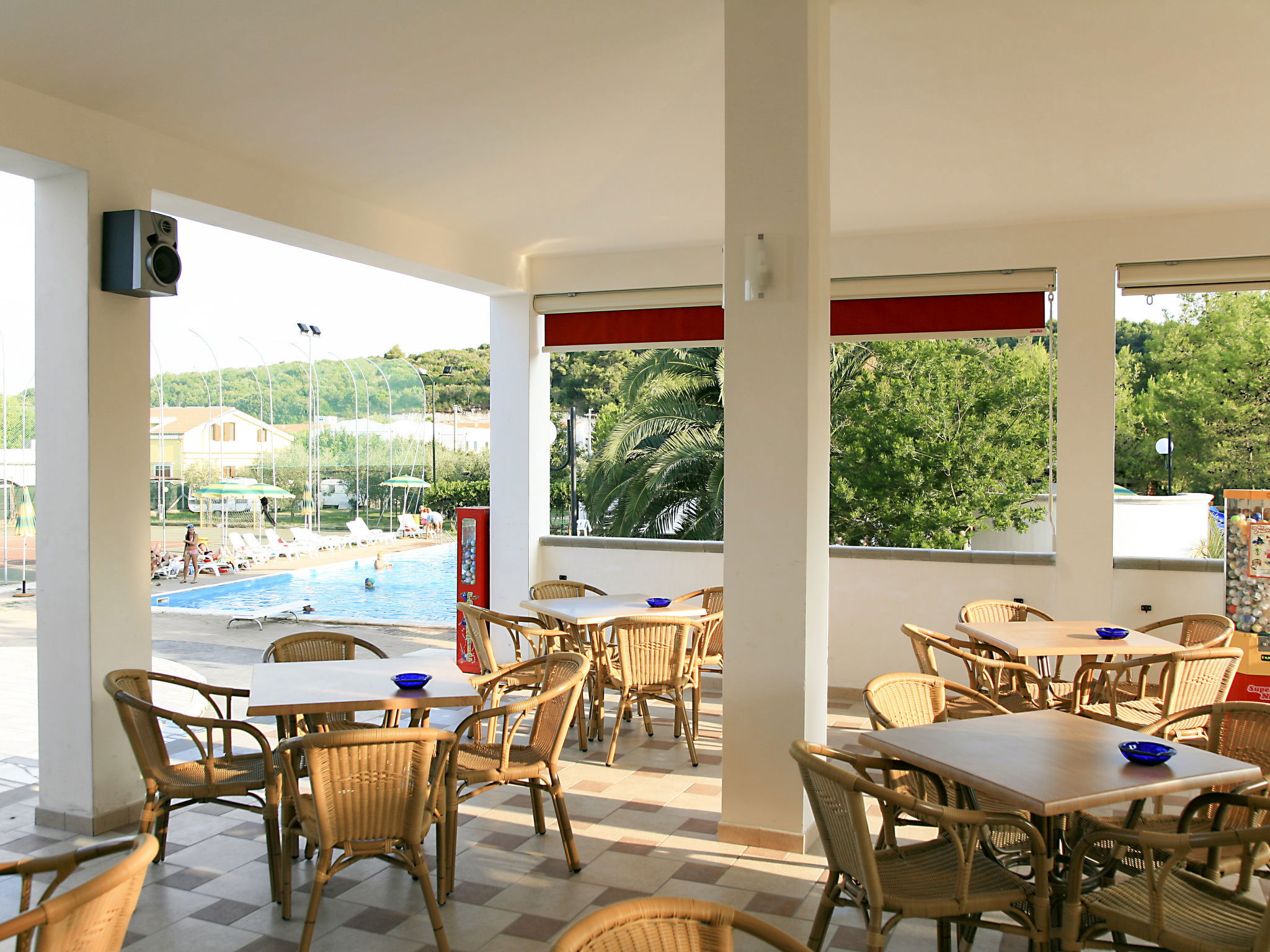 Gargano: Child friendly resort "Villaggio San Pablo". 35 houses in the resort. 70 apartments in the residence. 6 km from the centre of Vieste, 150 m from the sea, 150 m from the beach. For shared use: property 10'000 m2 (fenced), garden with plants and trees, swimming pool (15 x 6 m, depth 100 - 180 cm, seasonal availability: 23.May. - 26.Sep.). WC in the pool area, children's pool, outdoor shower, hot tub, tennis (25.Apr. - 26.Sep.), table tennis, boccia, beach volleyball, barbecue, children's playground. In the complex: reception, restaurant, bar, lounge with TV, WiFi, fitness room, washing machine (for shared use, extra). Linen change (suppl. charge extra). Towel change (suppl. charge extra). Room cleaning on request (extra). Breakfast full board possible on request (extra). Parking (limited number of spaces). Supermarket 100 m, bus stop "San Pablo" 10 m, railway station "Foggia" 100 km, ferry "Vieste (Tremiti & Grotte Marine)" 6 km, sandy beach "Scialmarino" 150 m. Nearby attractions: Peschici 17 km, Baia delle Zagare 34 km, Monte Sant'Angelo 62 km. Hiking paths: Foresta Umbra 20 km. Please note: car recommended. Entertainment in the season. Suitable for families (extra). 24hr guard. Obligation to wear bathing caps.