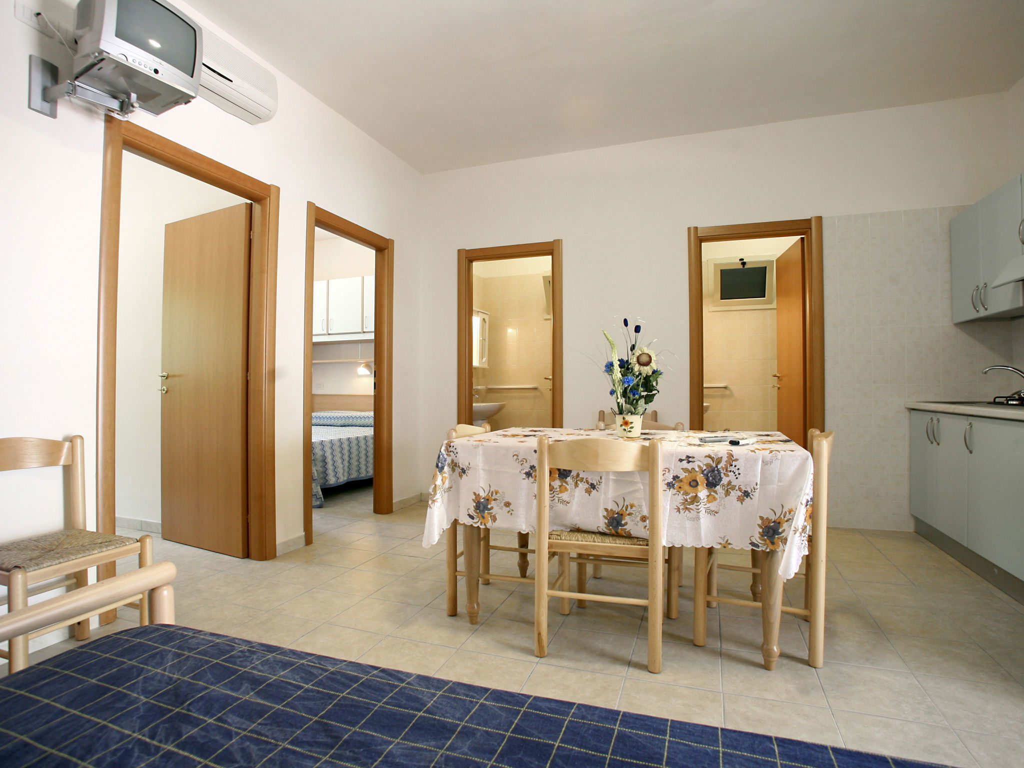 3-room terraced house 50 m2, on the upper ground floor. Practical furnishings: living/sleeping room with 1 sofabed, 1 pull-out bed, dining table and TV. Exit to the terrace. 2 double bedrooms. Kitchenette (4 hot plates). Shower/bidet/WC, sep. WC. Heating (extra), air-conditioning (extra). Terrace roofed. Terrace furniture. Parking (1 car). Please note: maximum 1 small pet/ dog allowed. Private entrance. Wifi connection only available on the terrace/balcony (free). IT071060B200022608