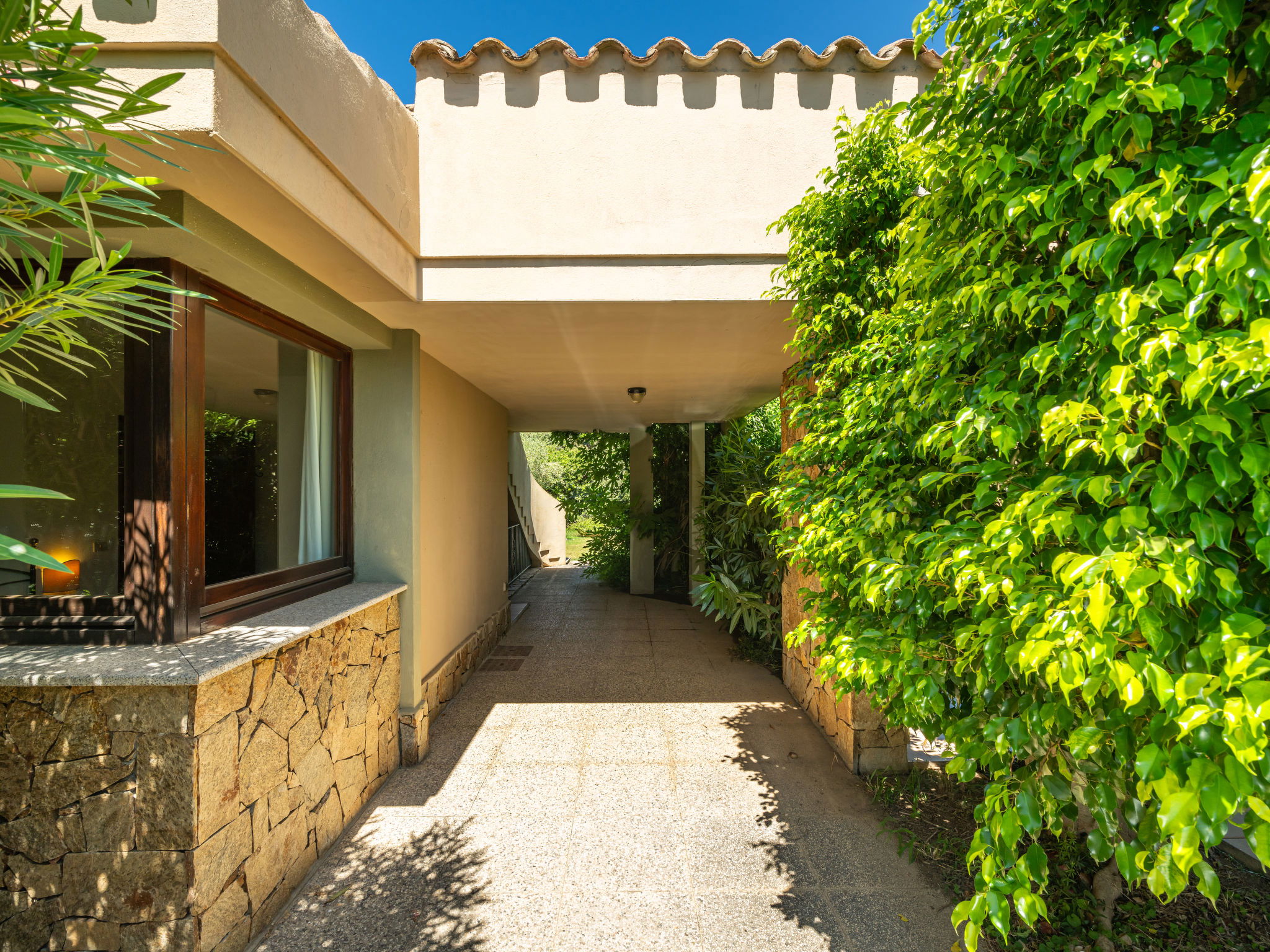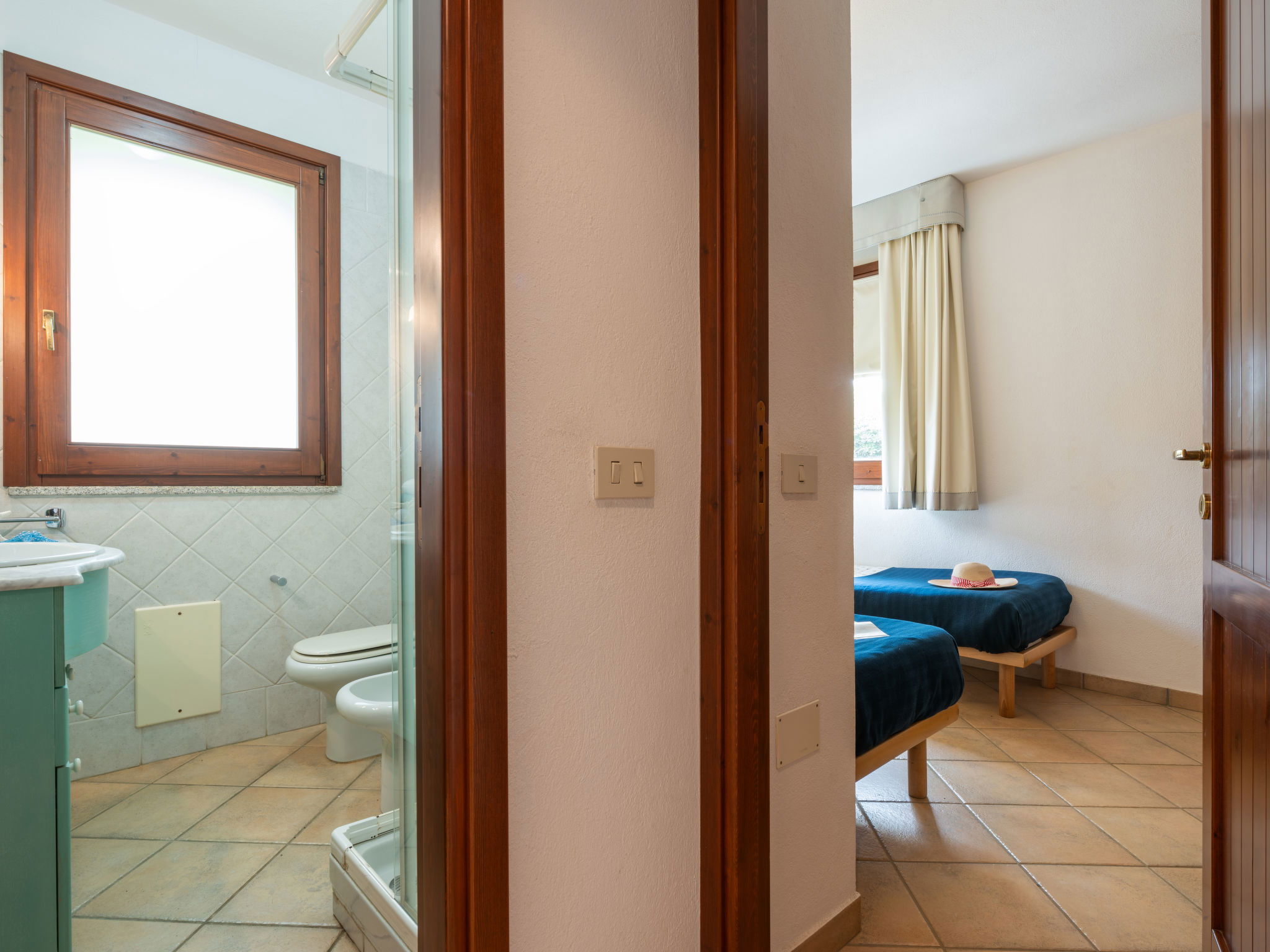 Small residence "Carlo", surrounded by trees and meadows. 2.5 km from the centre of Villasimius, in a sunny position residential area (villas), 400 m from the sea, in the countryside. For shared use: garden 200 m2. Private: outdoor shower. Motor access to the house (300 m via unmade road). Parking on the premises. Supermarket, restaurant, bar 200 m, bus stop "via Roma La Lanterna" 2 km, railway station "Cagliari" 60 km, ferry "Cagliari" 60 km, sandy beach 400 m. Sports harbour 1 km, golf course (18 hole) 1.5 km. Nearby attractions: Cagliari 50 km. Please note: car recommended. Animals in the neighbourhood. The photograph shows a typical example. The complex consists of 5 independent cottages, close to each other, all with roof terrace accessible via outdoor stairs.