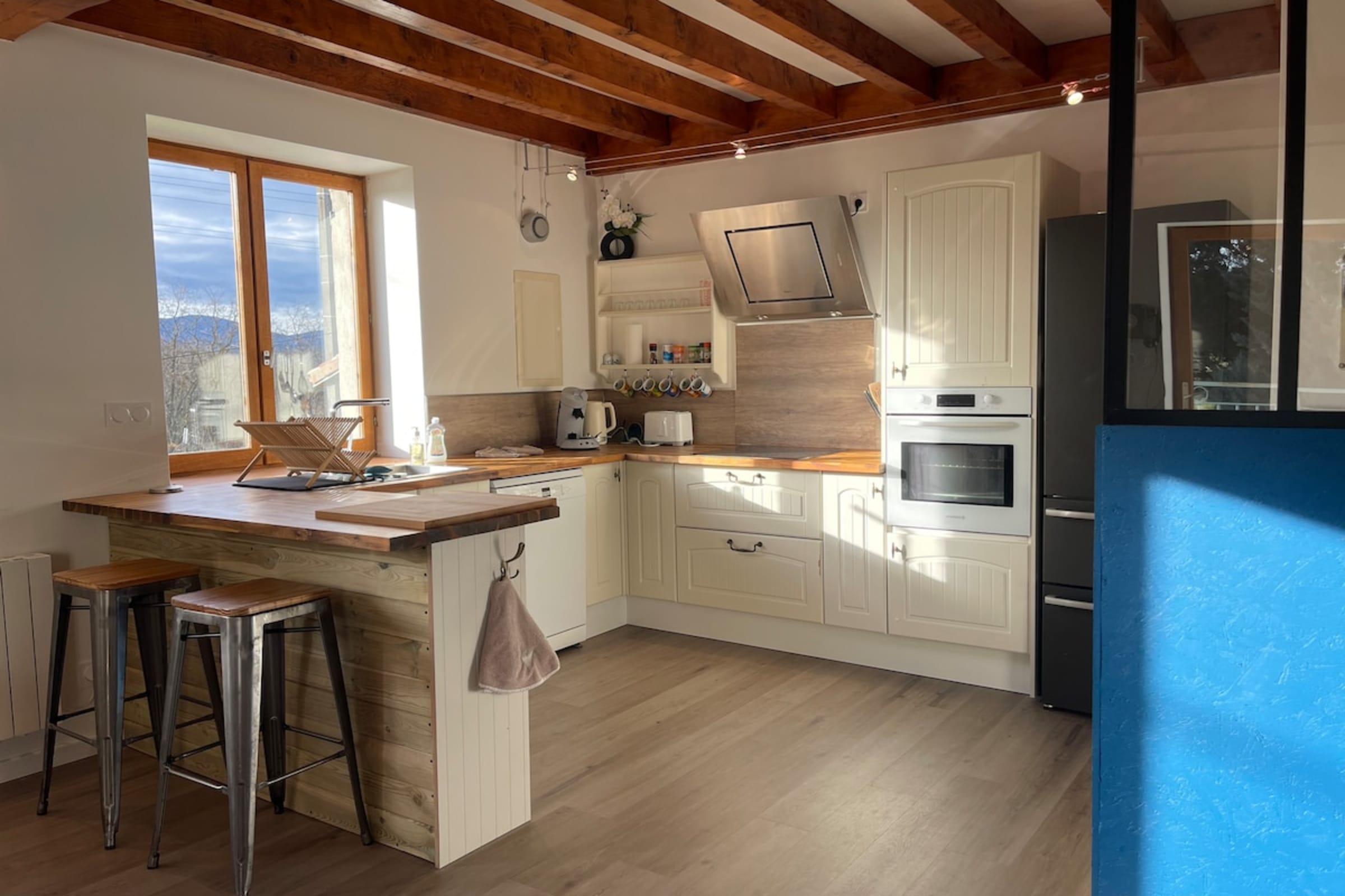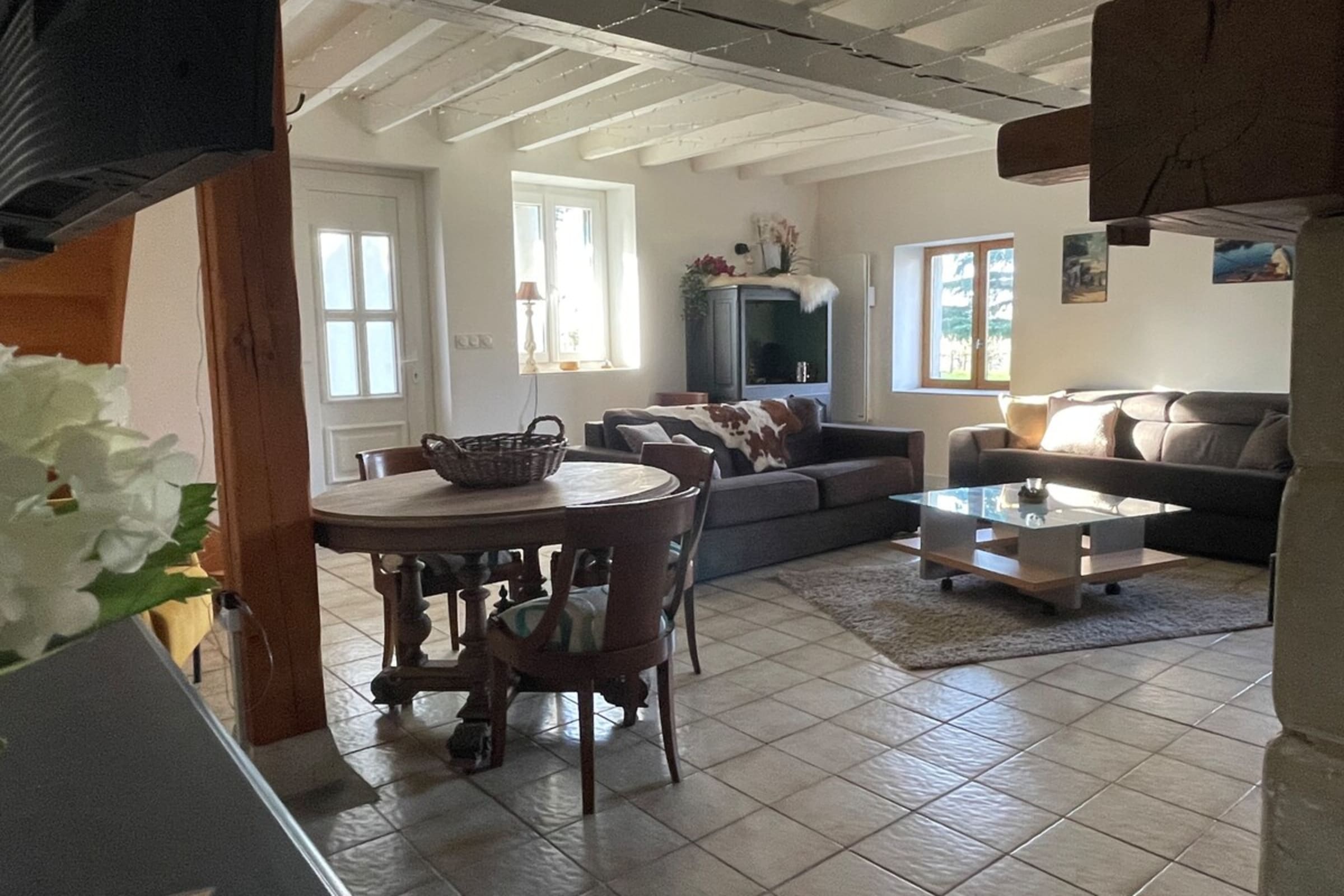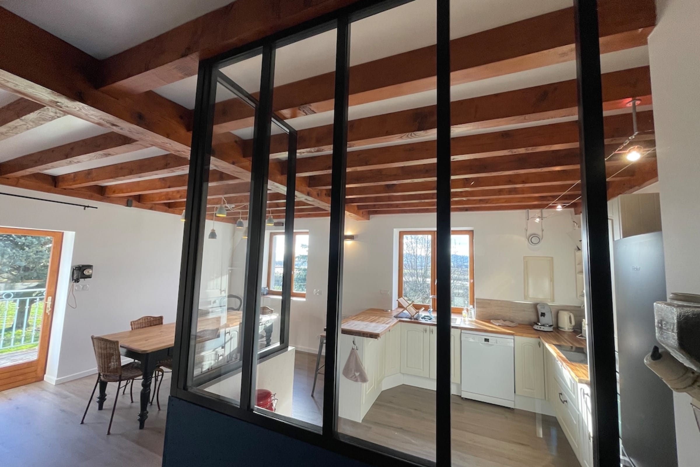 Upstairs, you’ll find a cozy, fully equipped kitchen that opens onto the dining room. You’ll also enjoy a pleasant terrace offering unobstructed views of the Pilat and the surrounding orchards—the perfect spot to relax and soak up the sun while enjoying breakfast or a gourmet snack surrounded by nature.