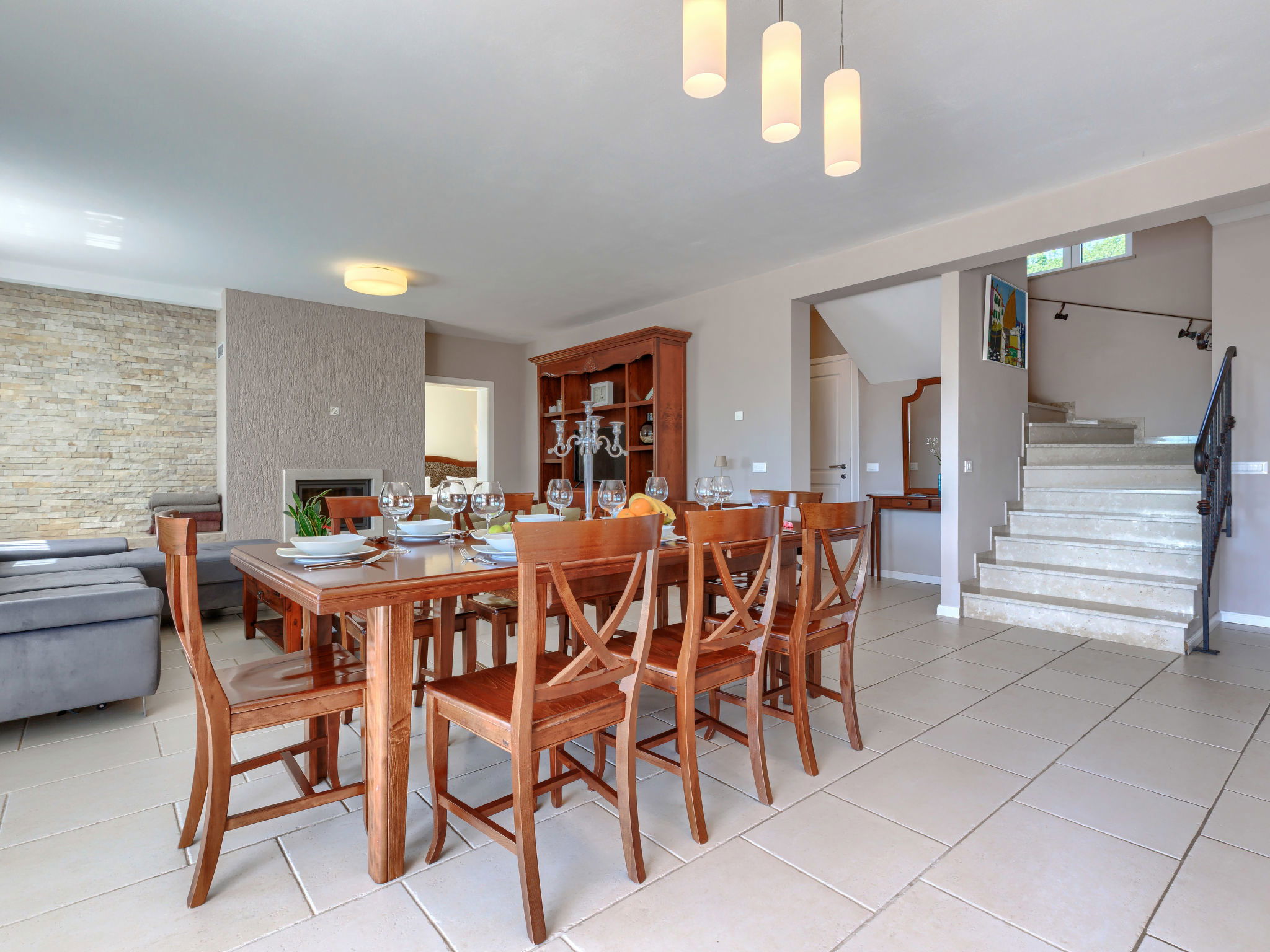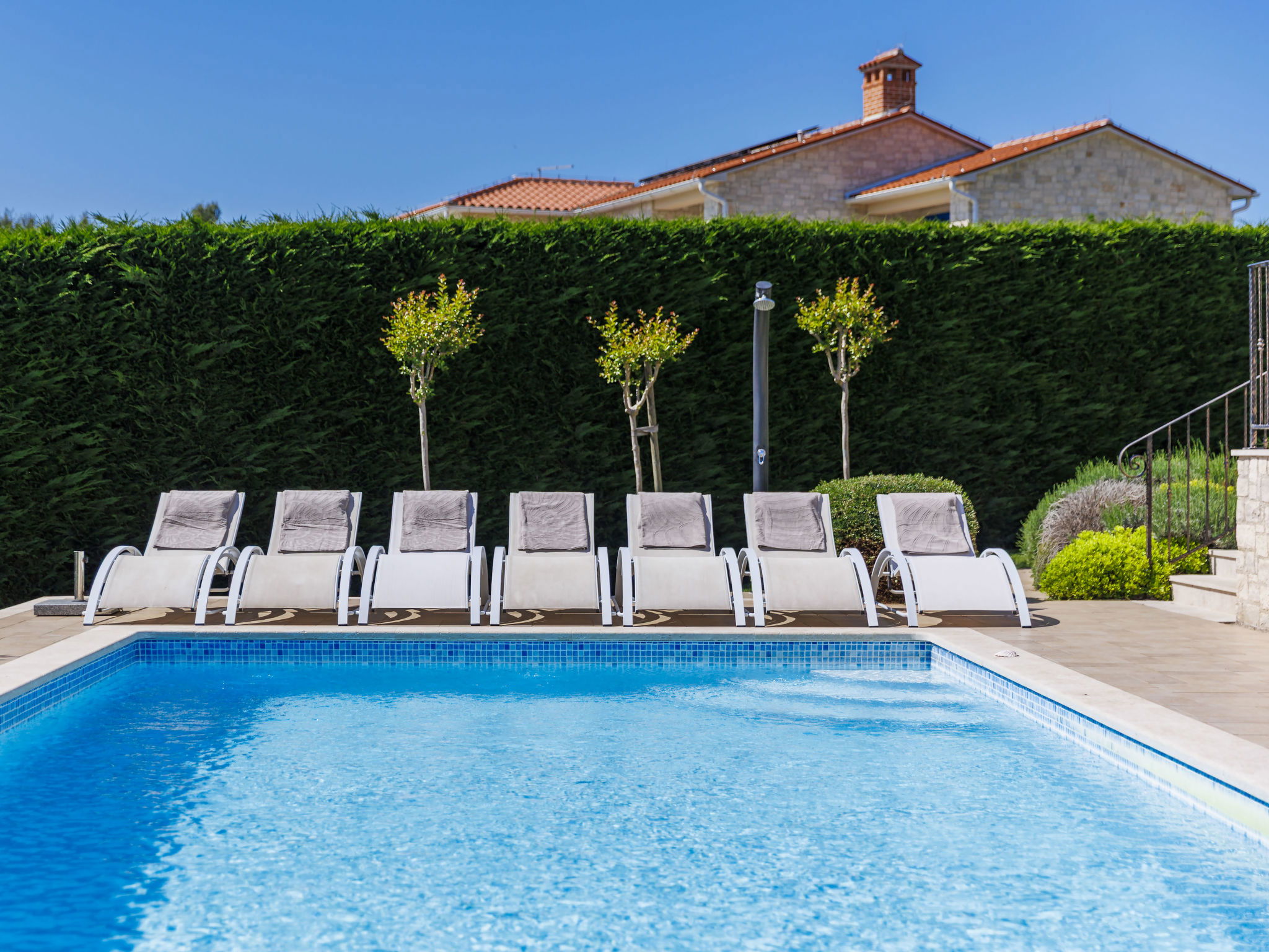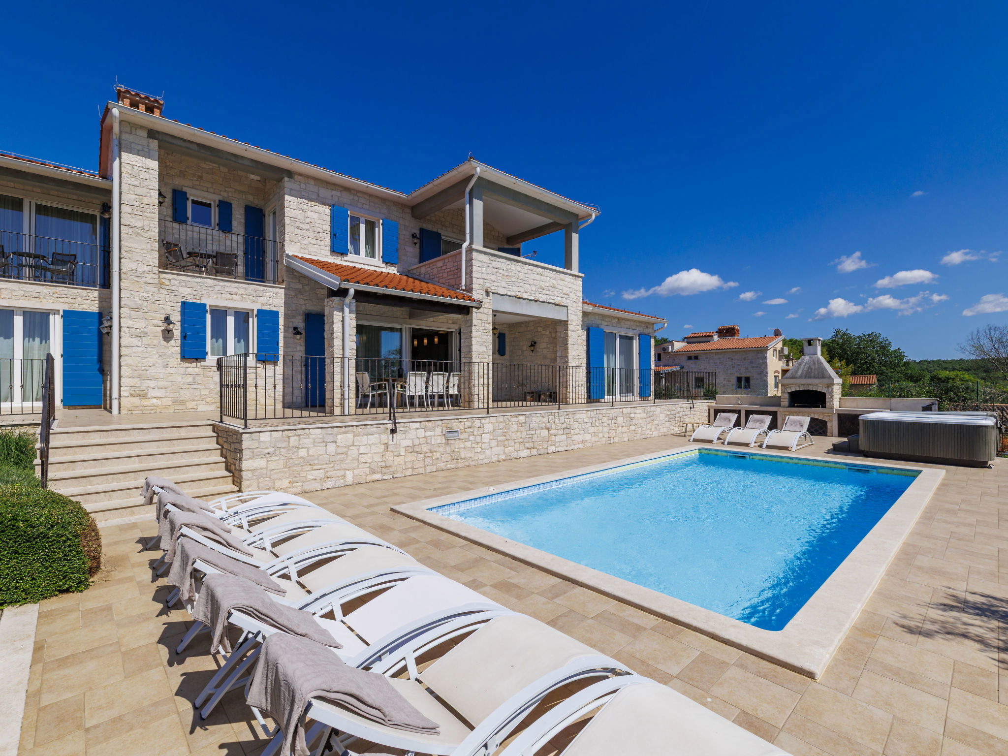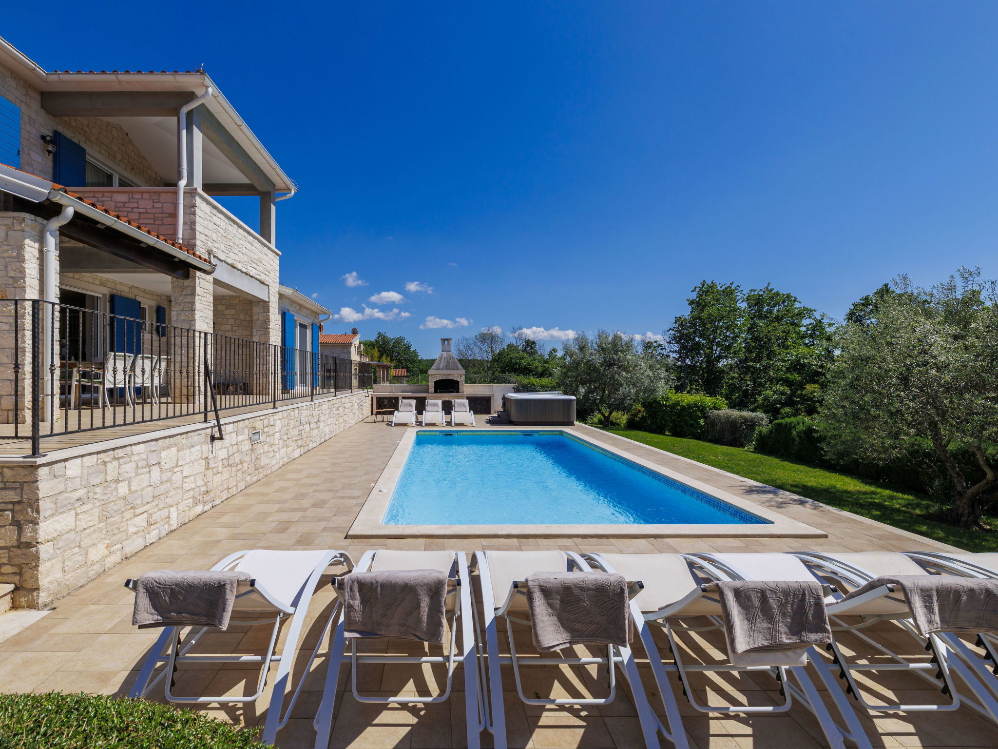 Beautiful villa "Babudri", 2 storeys. In the hamlet Strpačići 2 km from the centre of Višnjan, 12 km from the centre of Poreč, in a sunny position, 15 km from the sea, 15 km from the beach. Private: property 1'120 m2 (fenced) with lawn, swimming pool angular, heated (4 x 8 m, depth 140 cm, seasonal availability: 01.May. - 01.Nov.) with internal staircase. Outdoor shower, hot tub, garden furniture, barbecue. In the house: internet access, sauna, washing machine, tumble dryer. Parking (for 3 cars) at the house on the premises. Supermarket 2 km, restaurant 2 km, bus stop 3 km, pebble beach 15 km, rocky beach 15 km. Walking paths from the house 100 m, cycle lane 150 m. Swimming pool heated (extra).