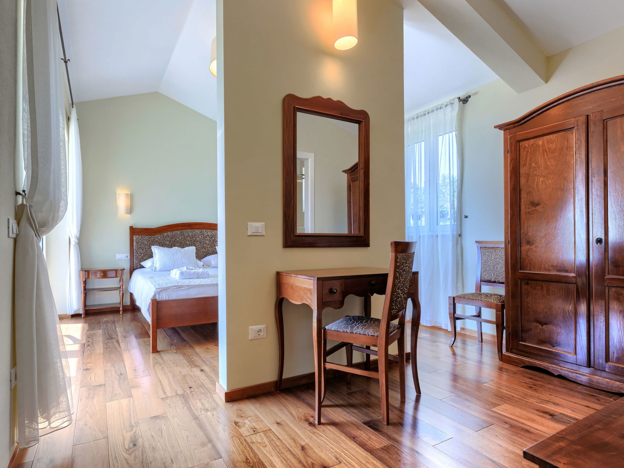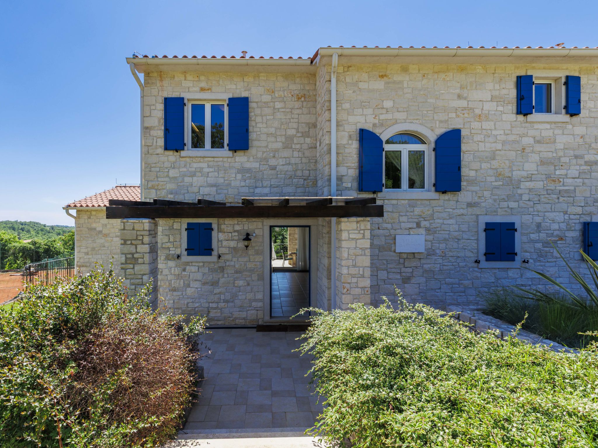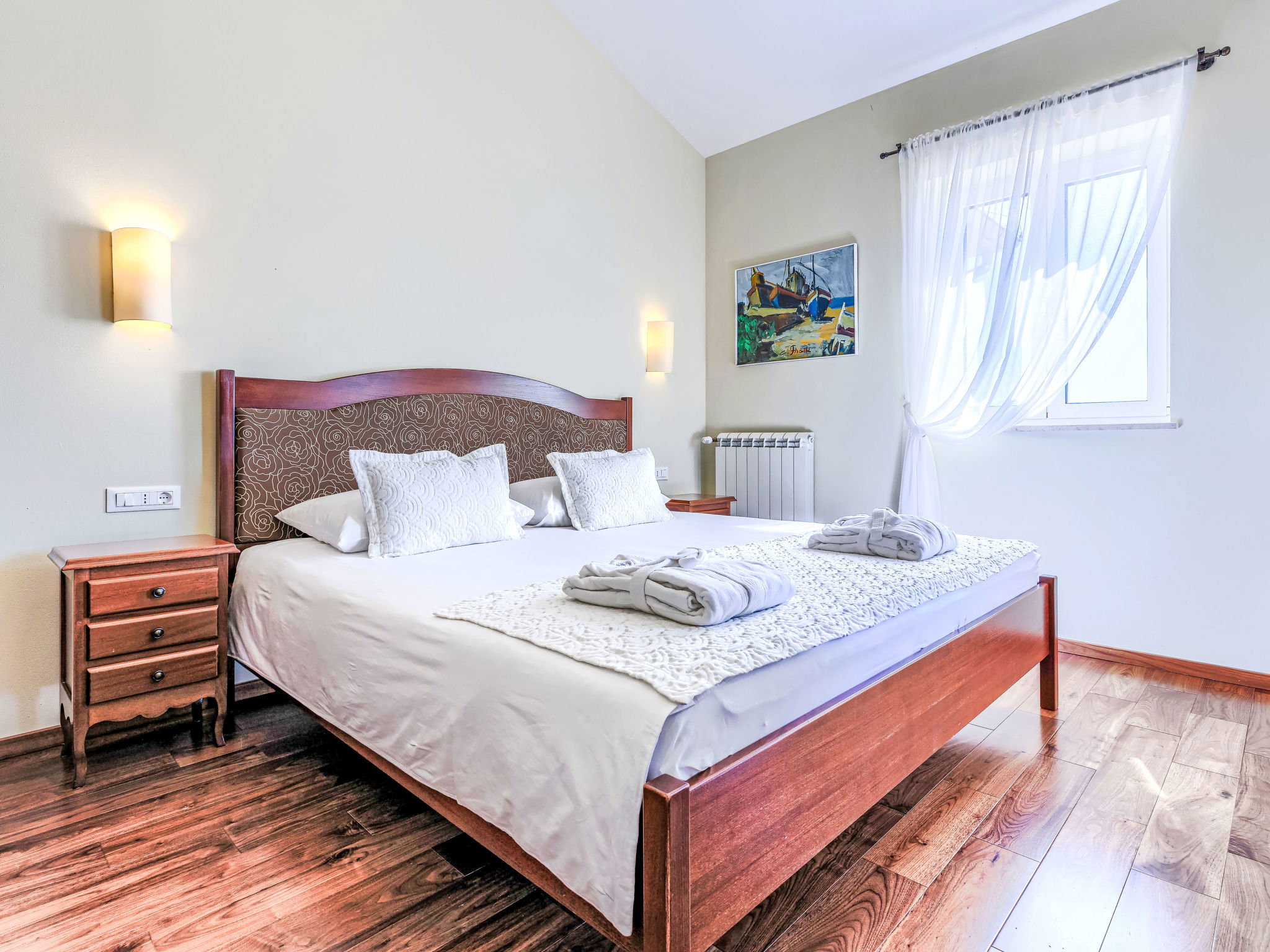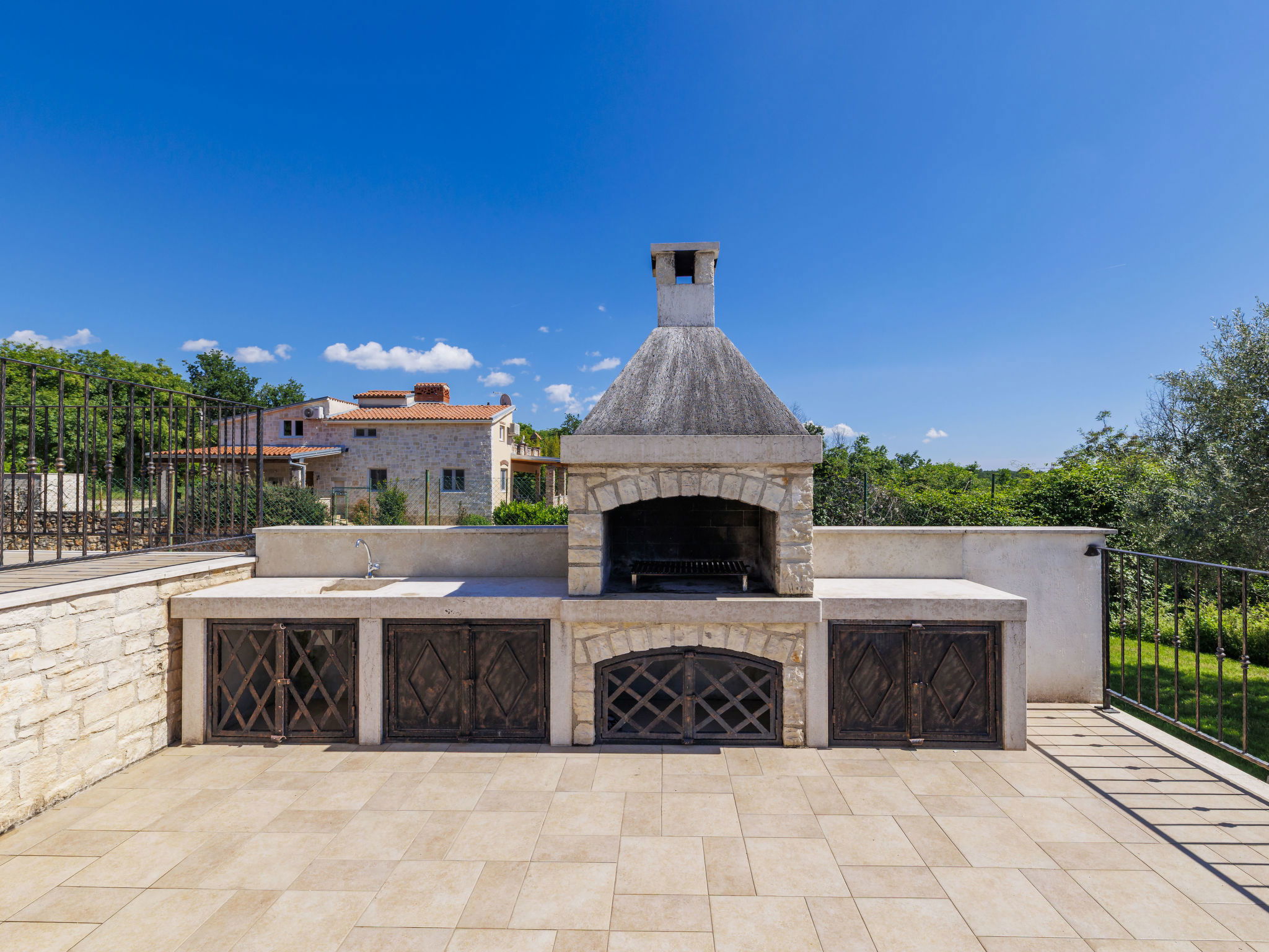 Beautiful villa "Babudri", 2 storeys. In the hamlet Strpačići 2 km from the centre of Višnjan, 12 km from the centre of Poreč, in a sunny position, 15 km from the sea, 15 km from the beach. Private: property 1'120 m2 (fenced) with lawn, swimming pool angular, heated (4 x 8 m, depth 140 cm, seasonal availability: 01.May. - 01.Nov.) with internal staircase. Outdoor shower, hot tub, garden furniture, barbecue. In the house: internet access, sauna, washing machine, tumble dryer. Parking (for 3 cars) at the house on the premises. Supermarket 2 km, restaurant 2 km, bus stop 3 km, pebble beach 15 km, rocky beach 15 km. Walking paths from the house 100 m, cycle lane 150 m. Swimming pool heated (extra).