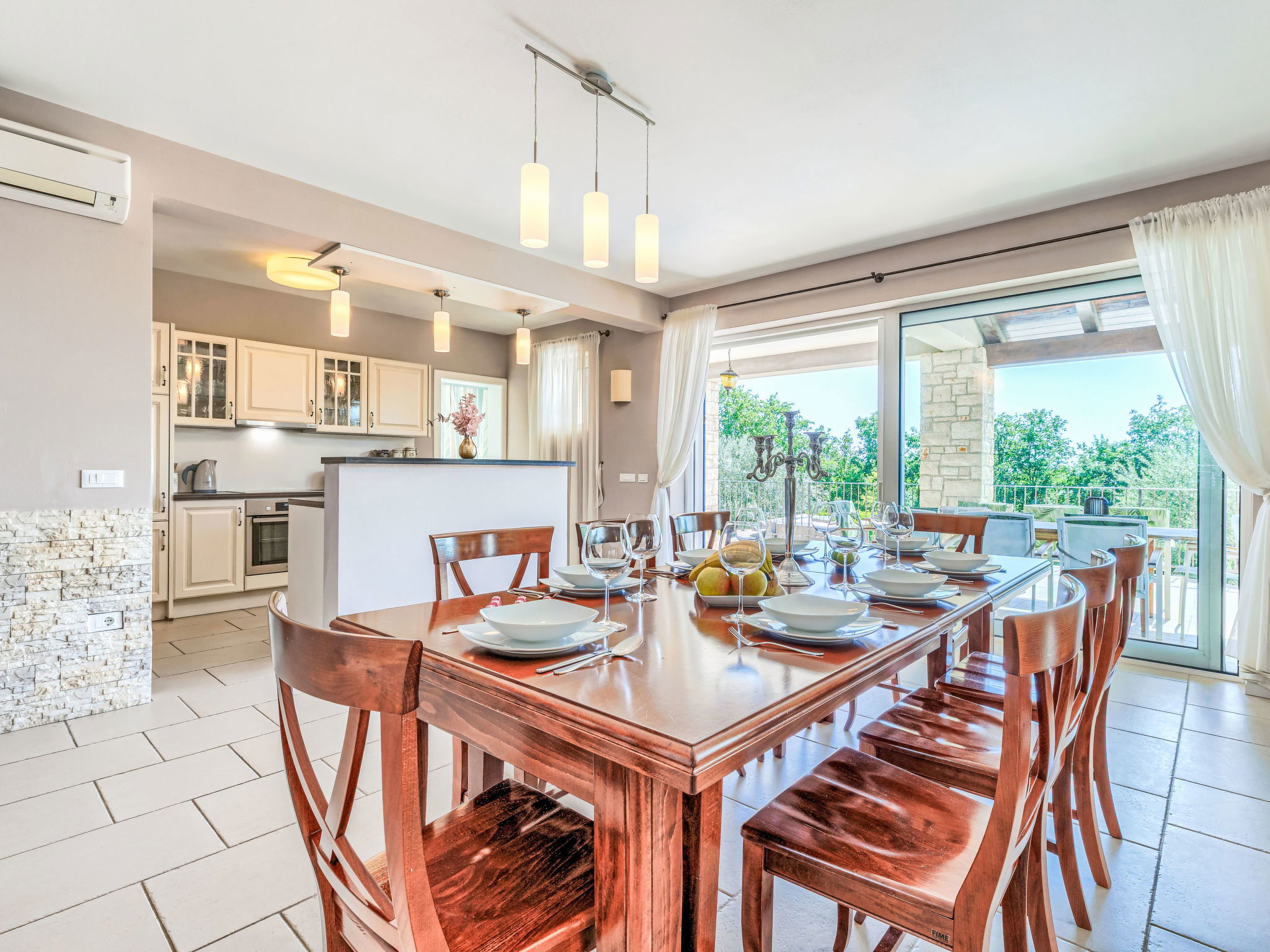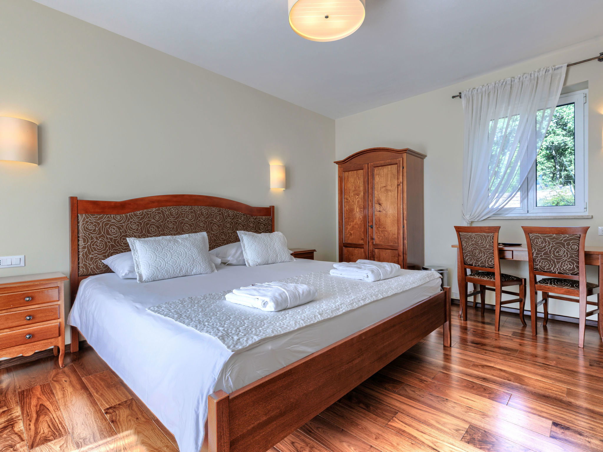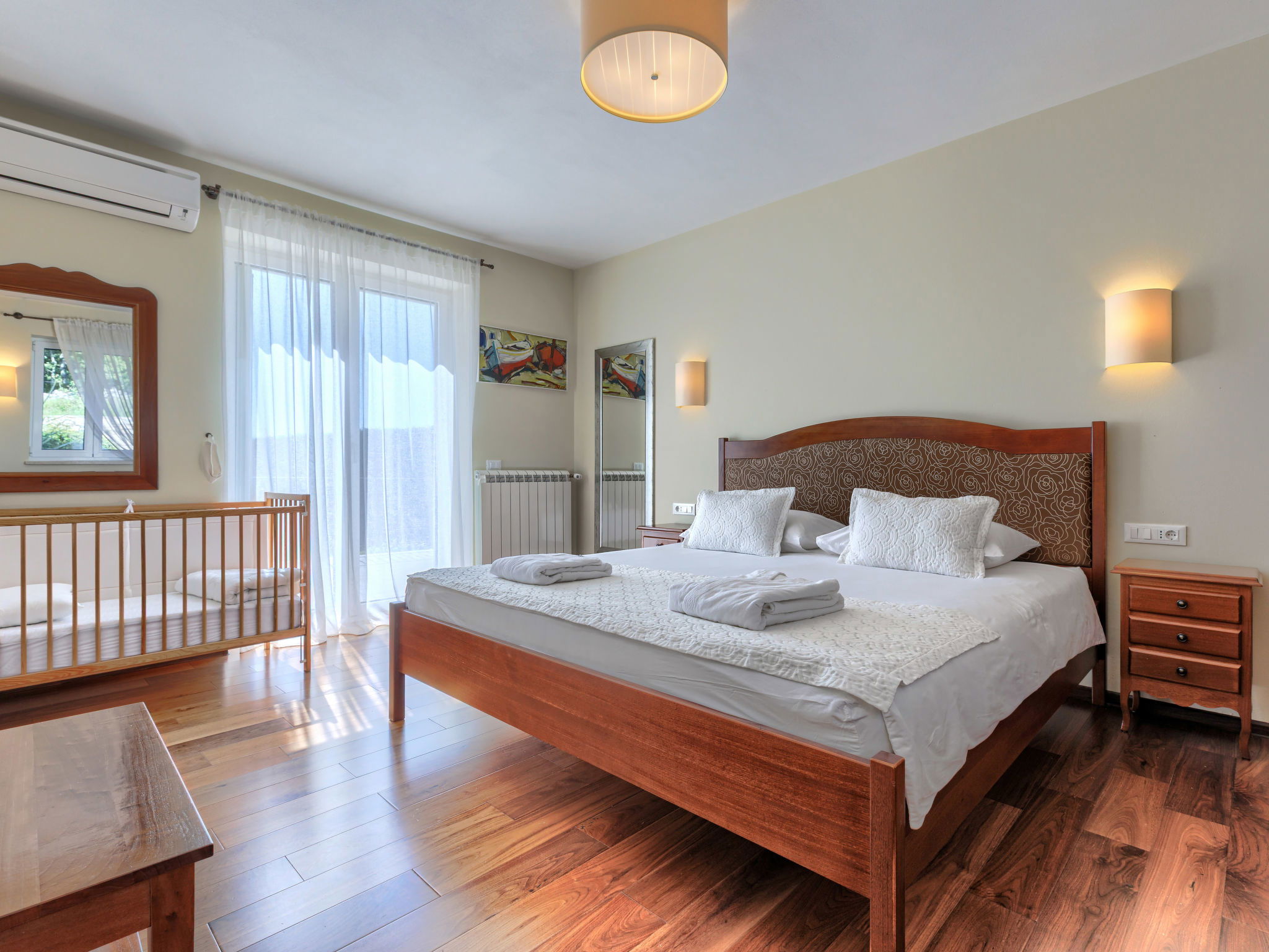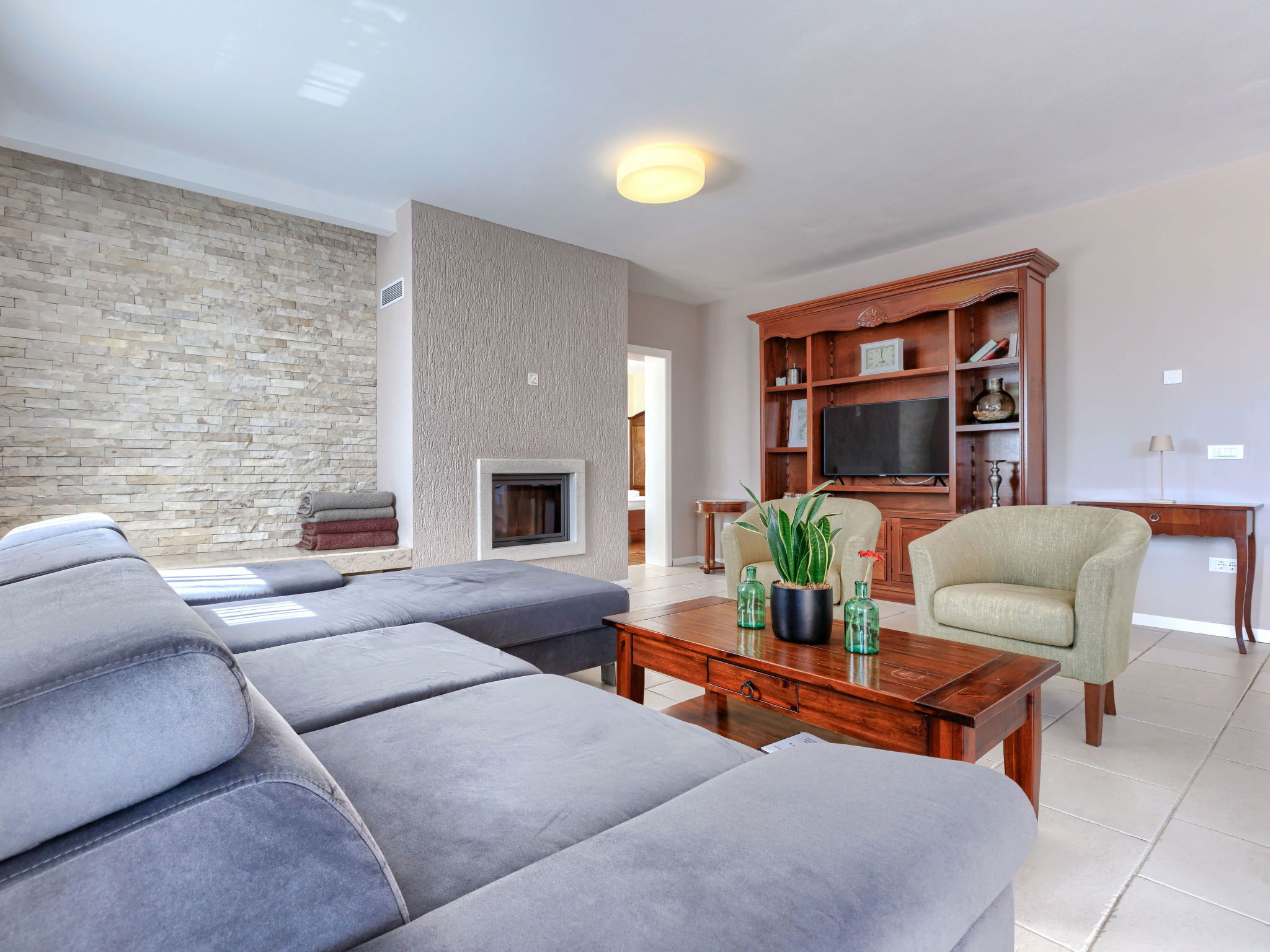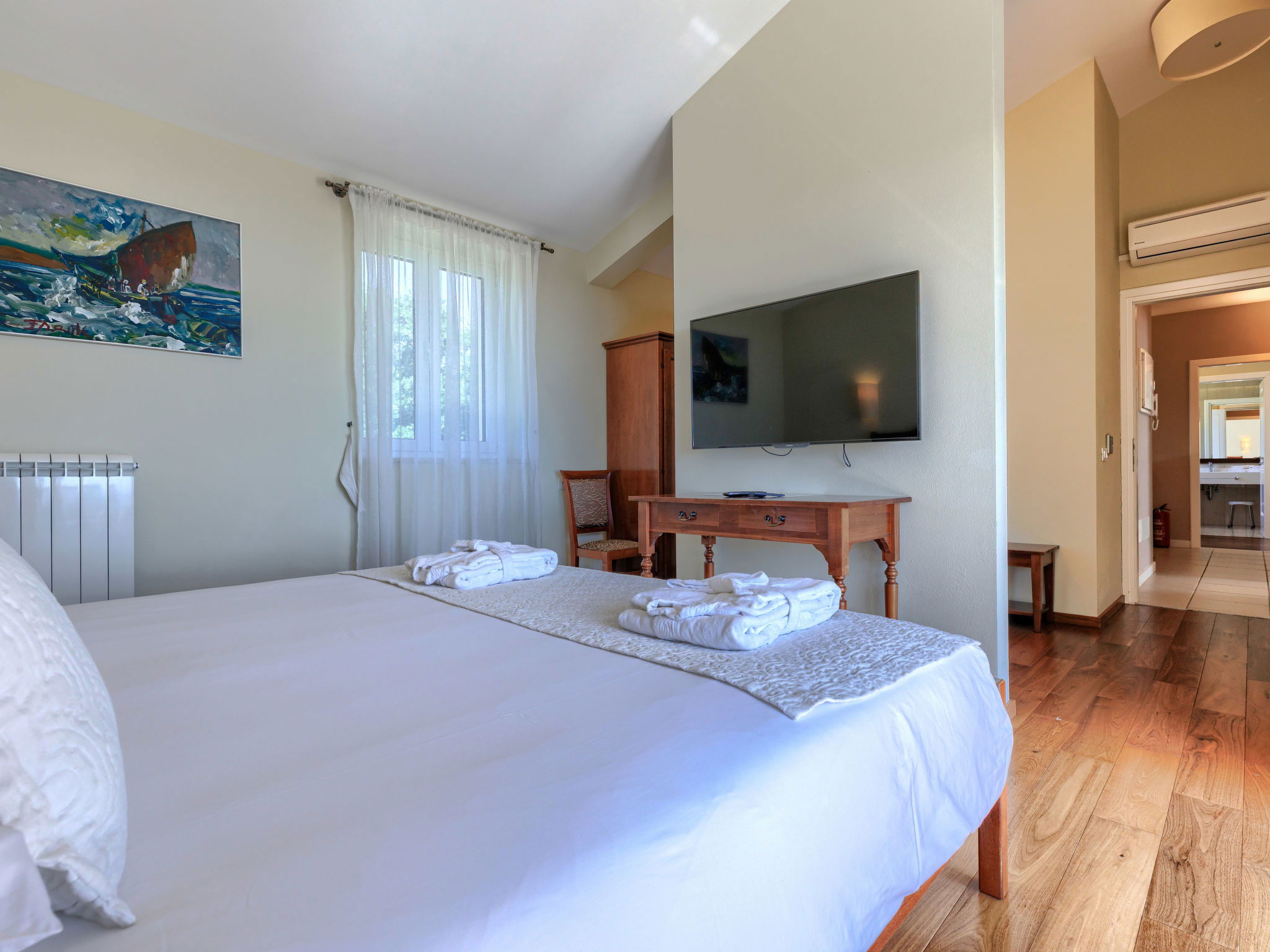 Beautiful villa "Babudri", 2 storeys. In the hamlet Strpačići 2 km from the centre of Višnjan, 12 km from the centre of Poreč, in a sunny position, 15 km from the sea, 15 km from the beach. Private: property 1'120 m2 (fenced) with lawn, swimming pool angular, heated (4 x 8 m, depth 140 cm, seasonal availability: 01.May. - 01.Nov.) with internal staircase. Outdoor shower, hot tub, garden furniture, barbecue. In the house: internet access, sauna, washing machine, tumble dryer. Parking (for 3 cars) at the house on the premises. Supermarket 2 km, restaurant 2 km, bus stop 3 km, pebble beach 15 km, rocky beach 15 km. Walking paths from the house 100 m, cycle lane 150 m. Swimming pool heated (extra).