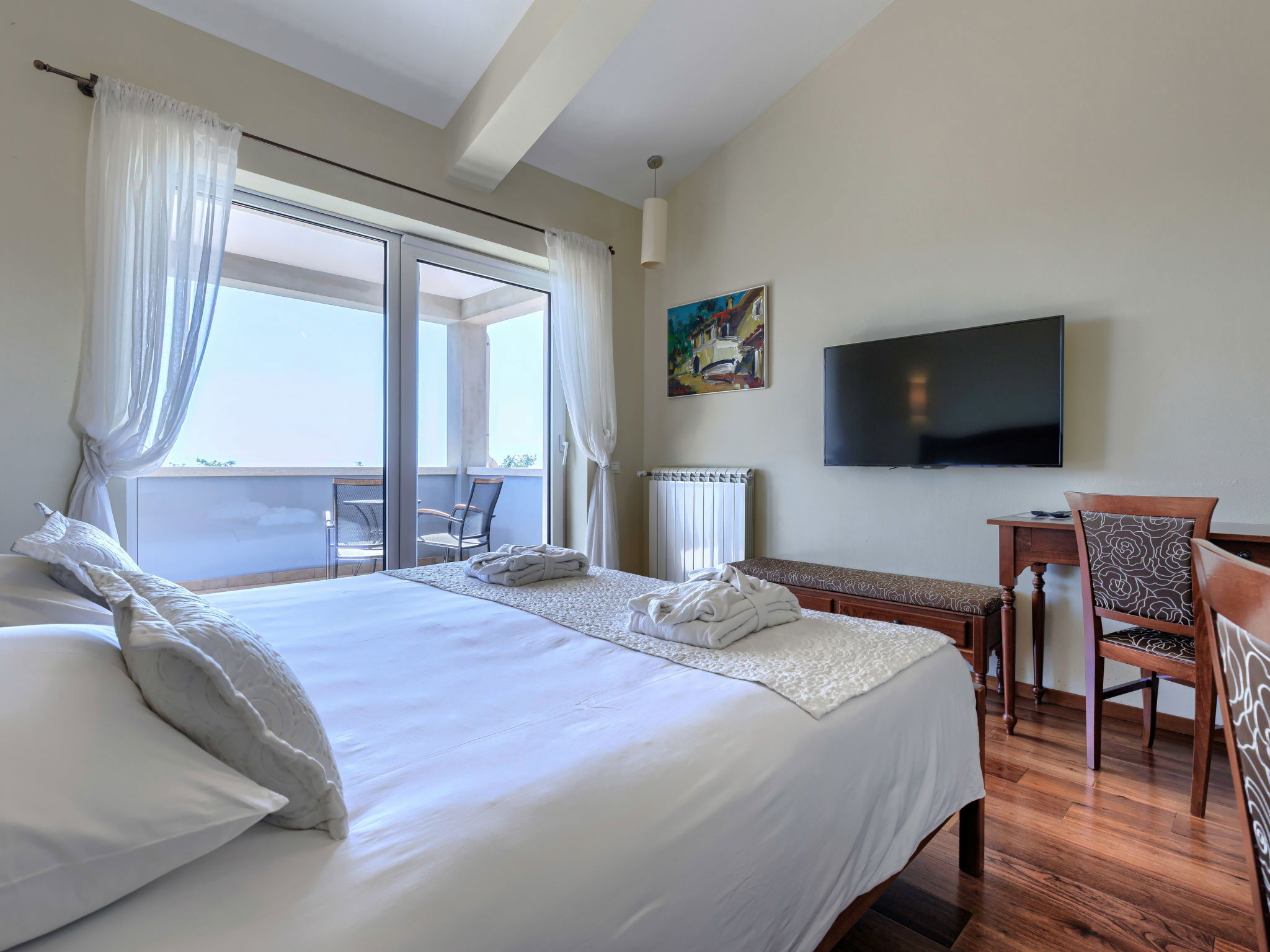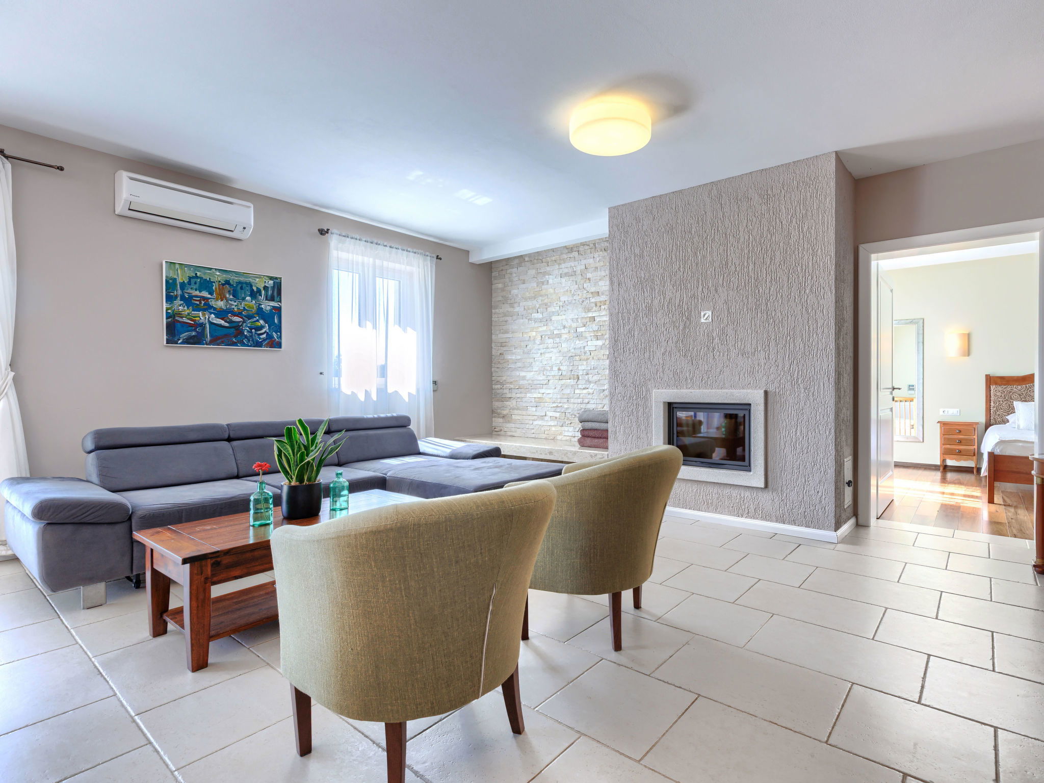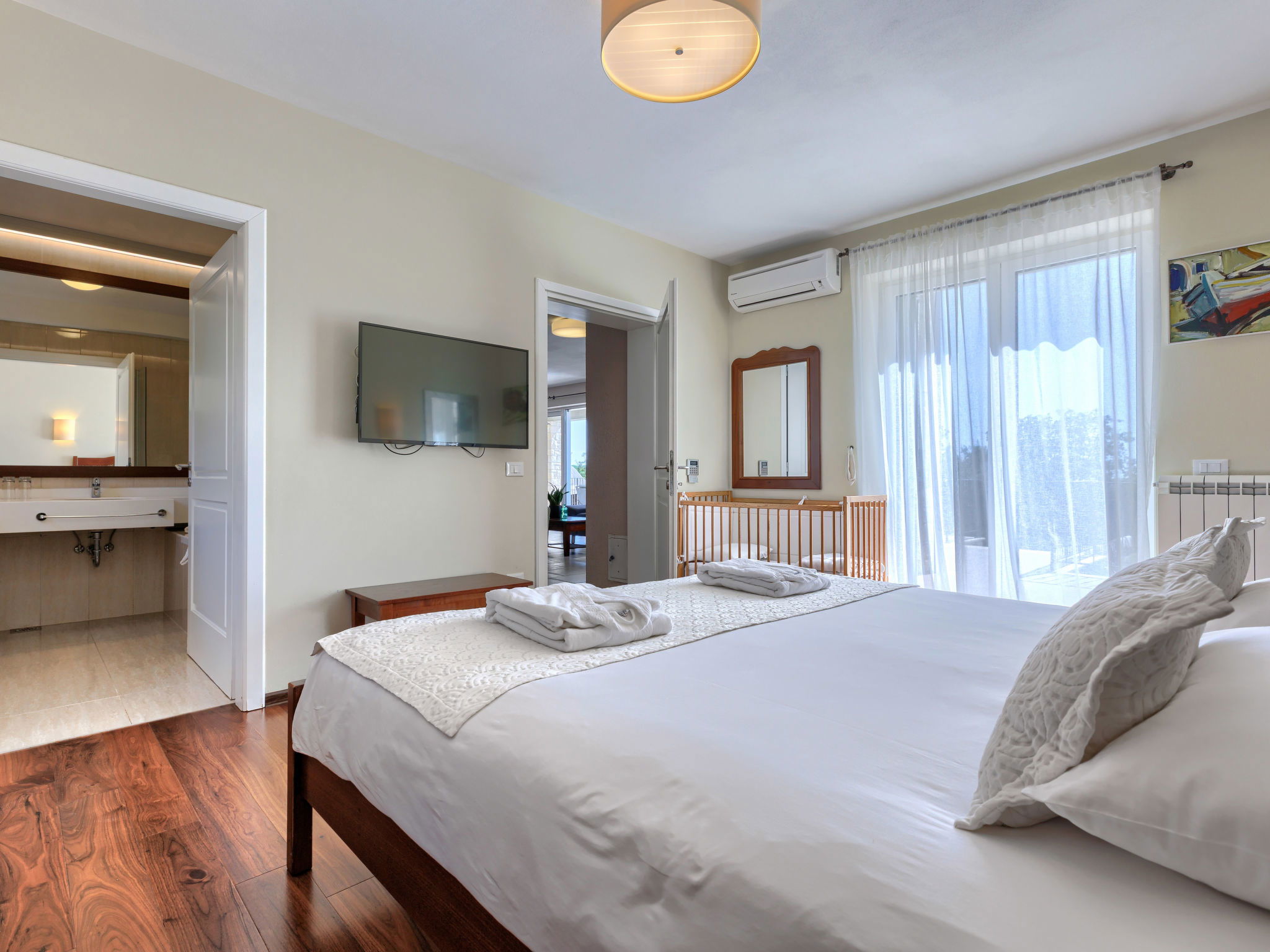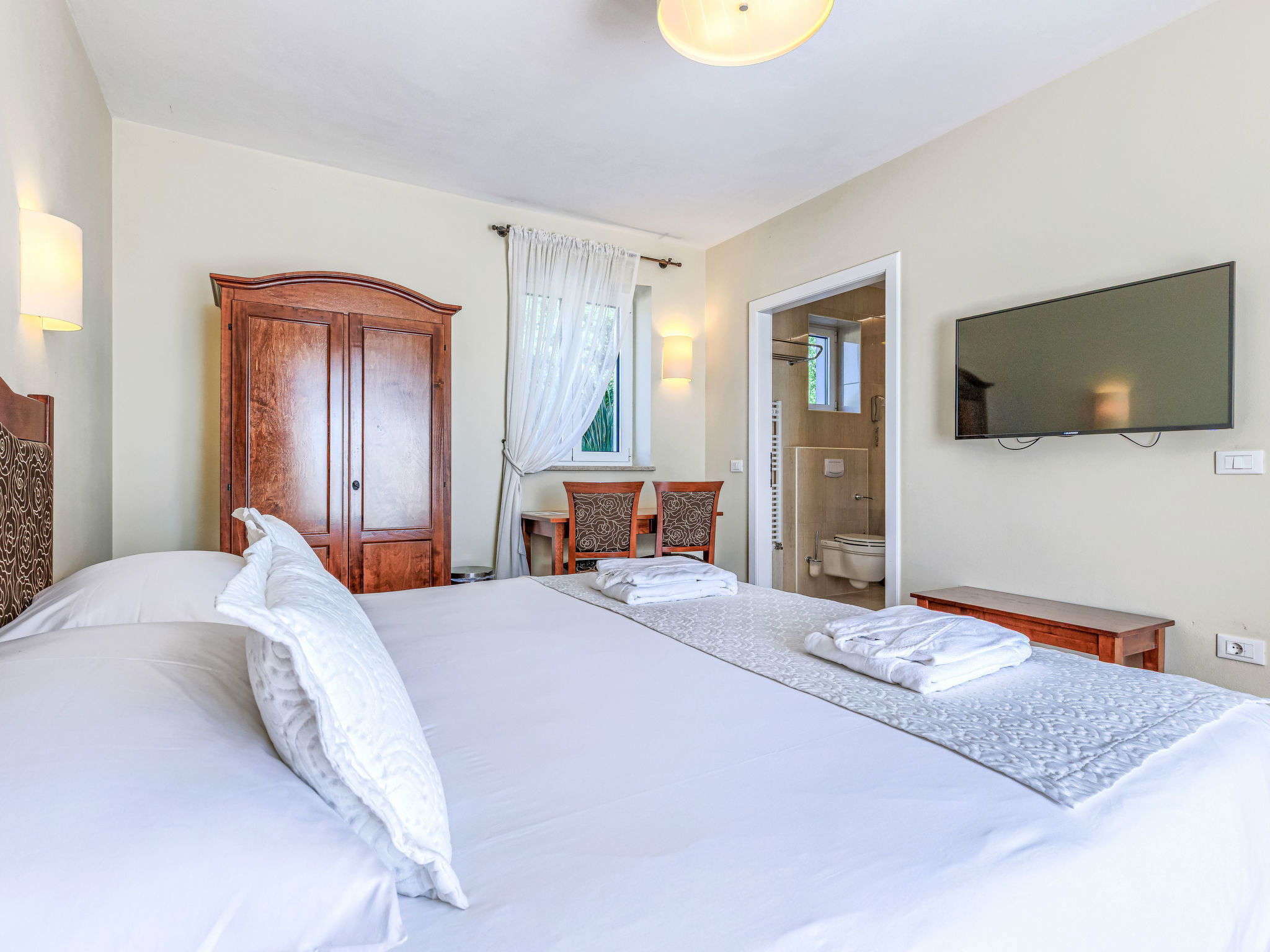 Beautiful villa "Babudri", 2 storeys. In the hamlet Strpačići 2 km from the centre of Višnjan, 12 km from the centre of Poreč, in a sunny position, 15 km from the sea, 15 km from the beach. Private: property 1'120 m2 (fenced) with lawn, swimming pool angular, heated (4 x 8 m, depth 140 cm, seasonal availability: 01.May. - 01.Nov.) with internal staircase. Outdoor shower, hot tub, garden furniture, barbecue. In the house: internet access, sauna, washing machine, tumble dryer. Parking (for 3 cars) at the house on the premises. Supermarket 2 km, restaurant 2 km, bus stop 3 km, pebble beach 15 km, rocky beach 15 km. Walking paths from the house 100 m, cycle lane 150 m. Swimming pool heated (extra).