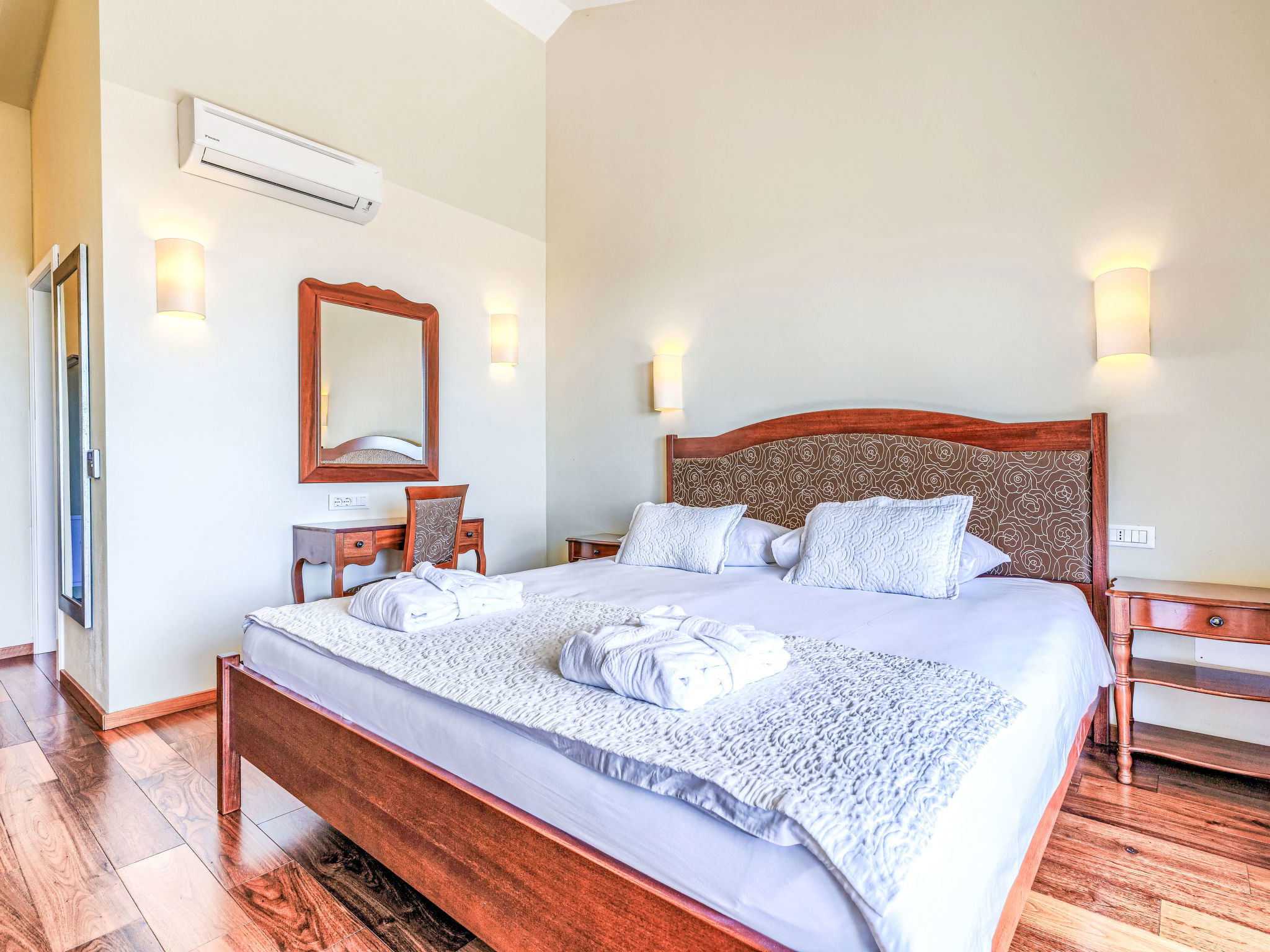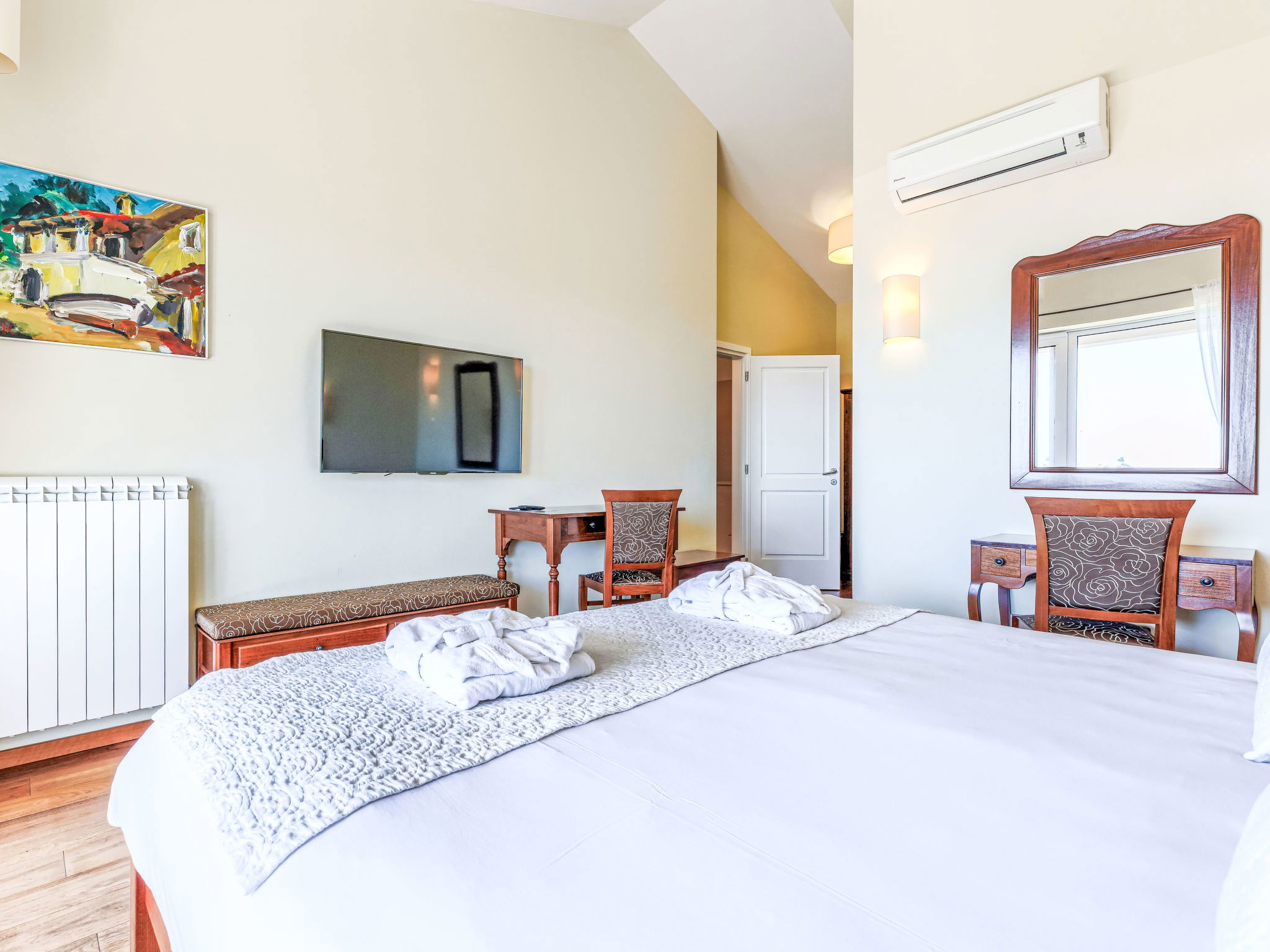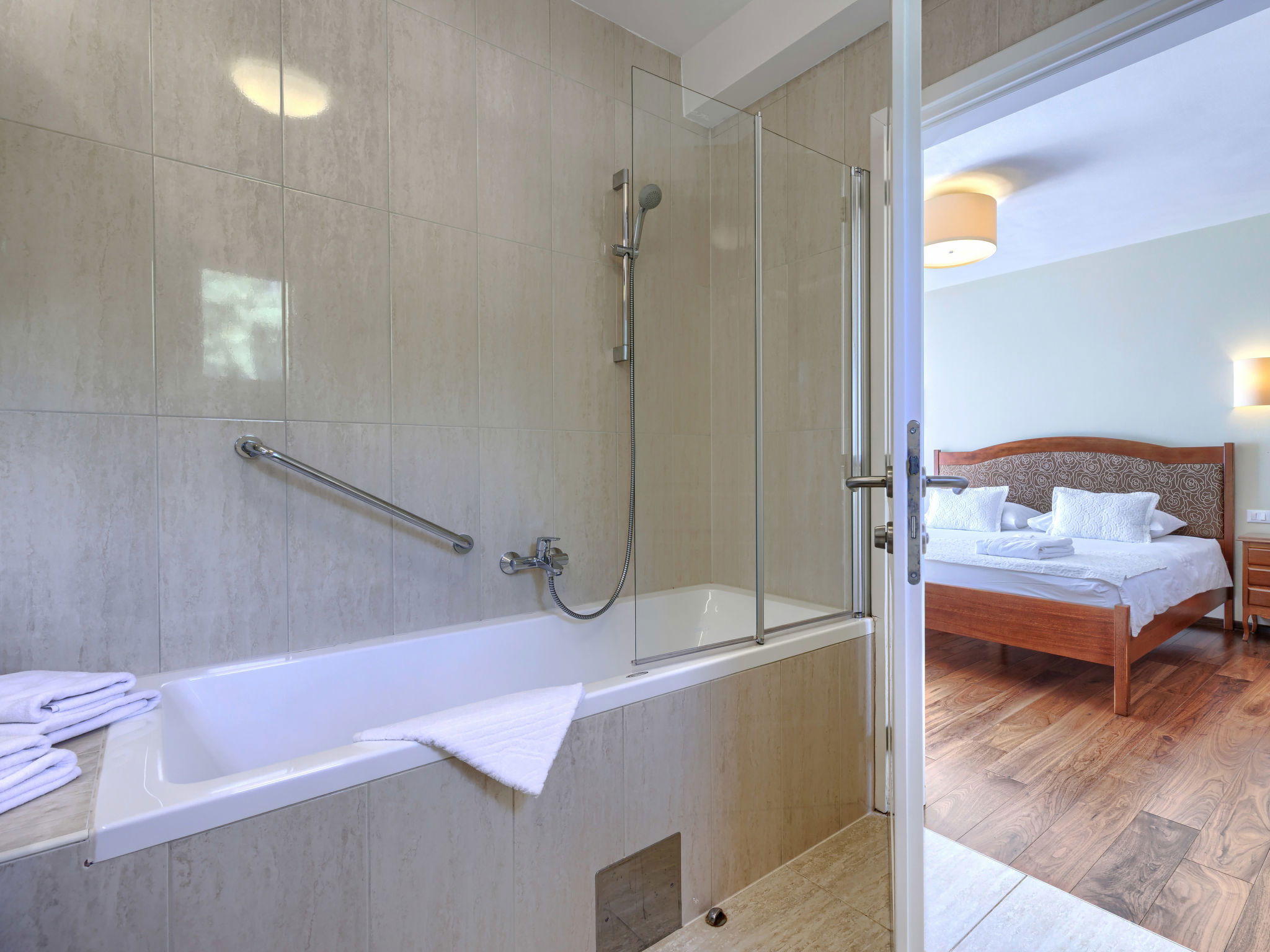 6-room villa 250 m2 on 2 levels. Tasteful and cosy furnishings: living/dining room with 1 double sofabed (180 cm, length 200 cm), open-hearth fireplace (only for decoration), satellite TV and air conditioning. Exit to the terrace. 1 room with 1 french bed (200 cm, length 210 cm), bath/WC, double hand-basin, satellite TV and air conditioning. Exit to the swimming pool. Open kitchen (oven, dishwasher, 4 ceramic glass hob hotplates, kettle, microwave, freezer, electric coffee machine). Sep. WC. Upper floor: 1 room with 1 french bed (200 cm, length 210 cm), bath/bidet/WC, double hand-basin, satellite TV and air conditioning. Exit to the terrace. 1 room with 1 french bed (200 cm, length 210 cm), bath/WC, double hand-basin, satellite TV and air conditioning. Exit to the terrace. 1 room with 1 french bed (200 cm, length 210 cm), bath/bidet/WC, double hand-basin, satellite TV and air conditioning. Exit to the terrace. Floor heating, forced-air heating. 2 terraces 3 m2, terrace 12 m2. Terrace furniture, deck chairs. Distant view of the sea. Facilities: safe, iron, mosquito net, children's high chair, baby cot, hair dryer. Internet (WiFi, free). Maximum 1 pet/ dog allowed.