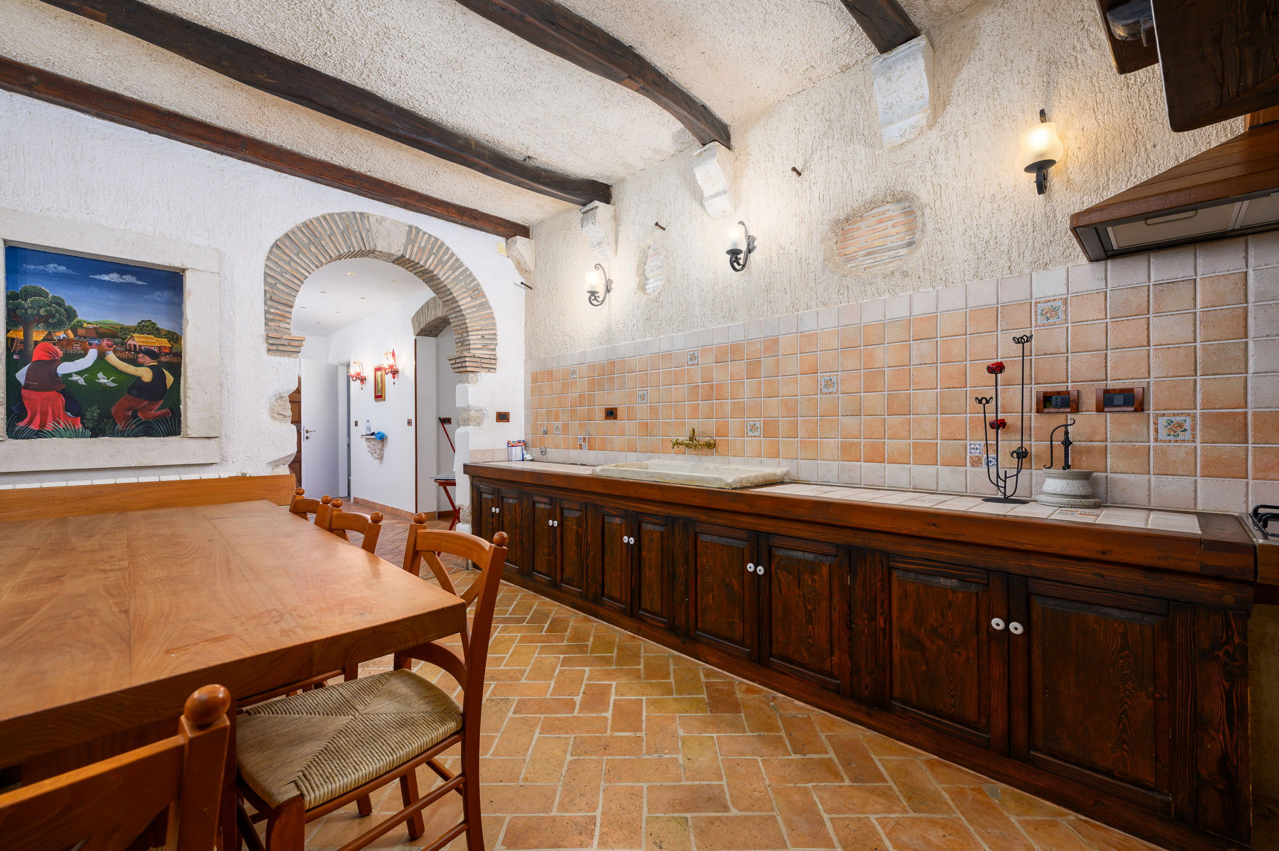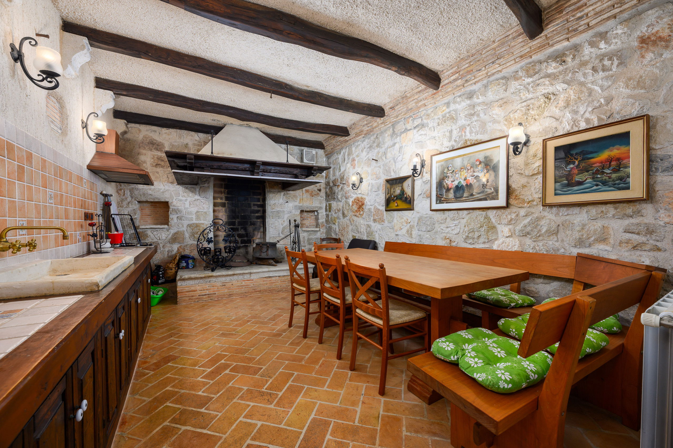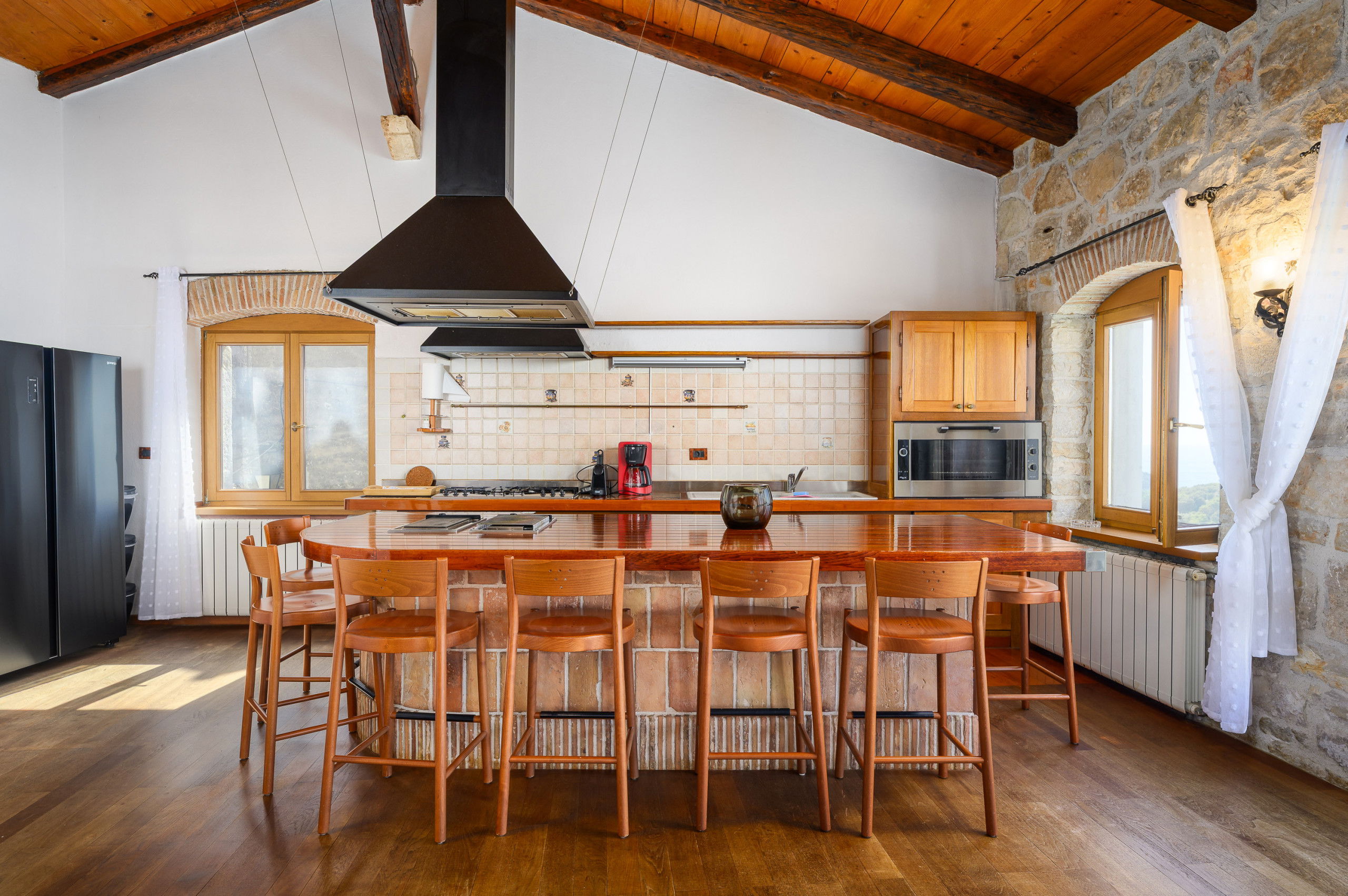 Upstairs, the floor features a spacious open-plan living area with another fireplace and a fully equipped kitchen. Large windows fill the space with natural light and open up to magnificent sea views across the Vrsar archipelago. The living room is air-conditioned and includes a pull-out sofa, providing additional sleeping space for two guests.