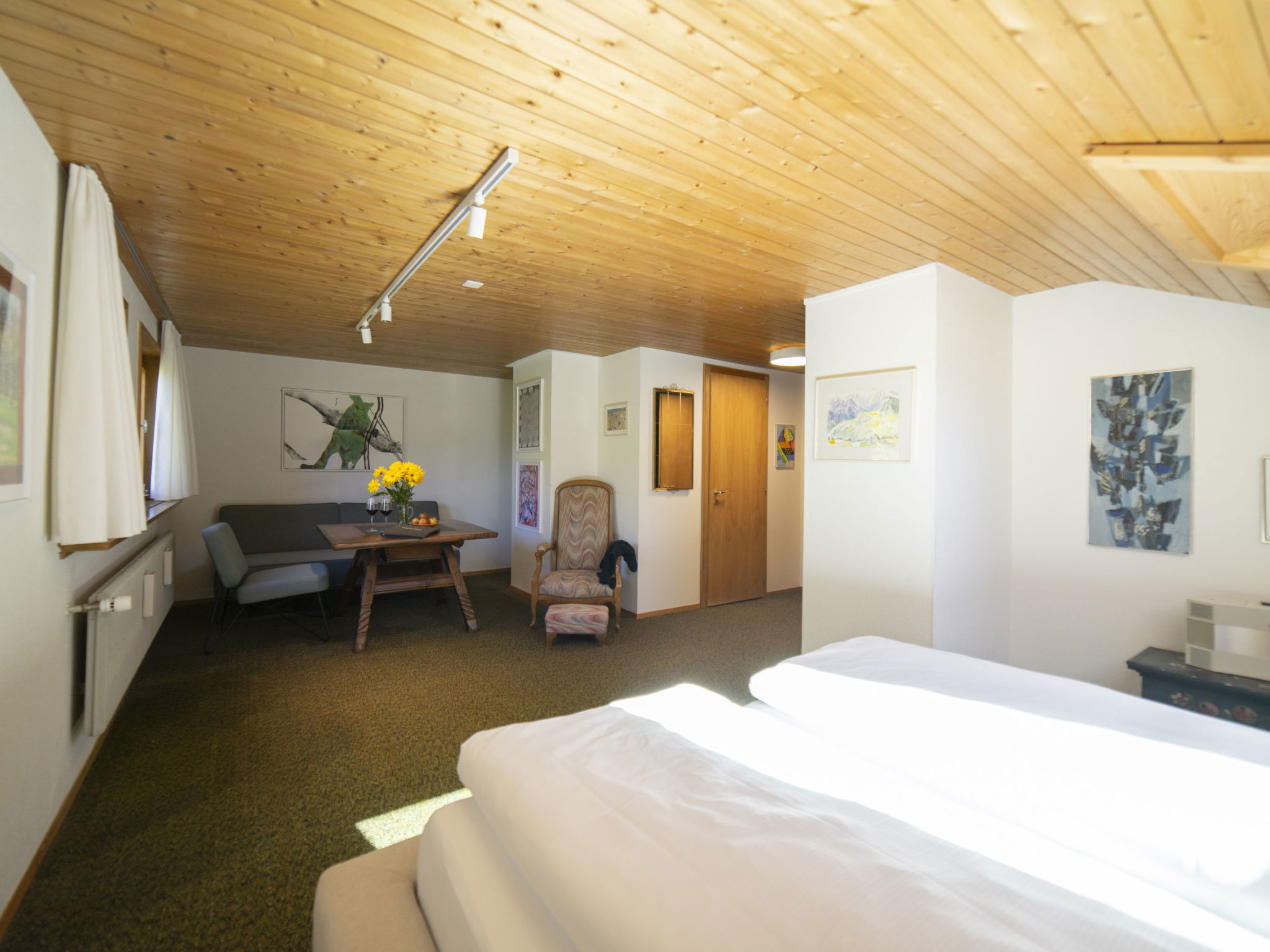 "Etienne", 4-room house 170 m2. Object suitable for 8 adults. 1 room with 1 double bed, TV and DVD. 1 room with 1 double bed. 1 room with 1 double bed. 1 room with 2 french beds. Kitchen (oven, dishwasher, 4 induction hot plates, toaster, kettle, electric coffee machine, raclette grill). 3 baths/WC, sep. WC. Terrace. Barbecue. View of the mountains and the ski run. Facilities: washing machine, dryer, sauna, hair dryer. Internet (WiFi, free). Please note: non-smokers only. 1 pet/ dog allowed.