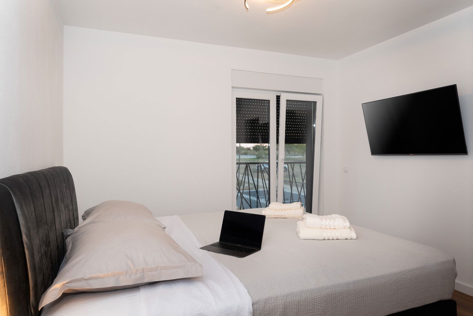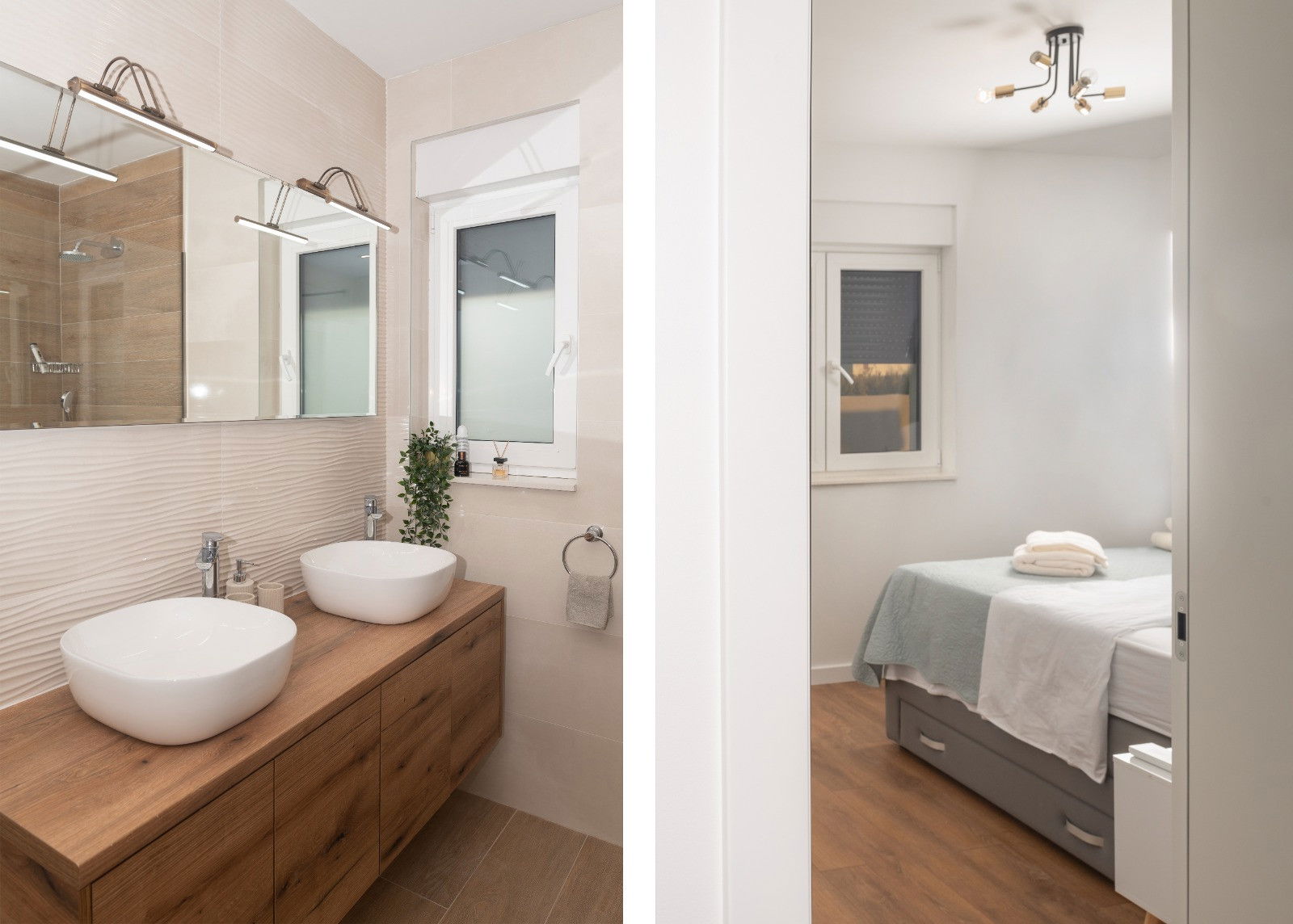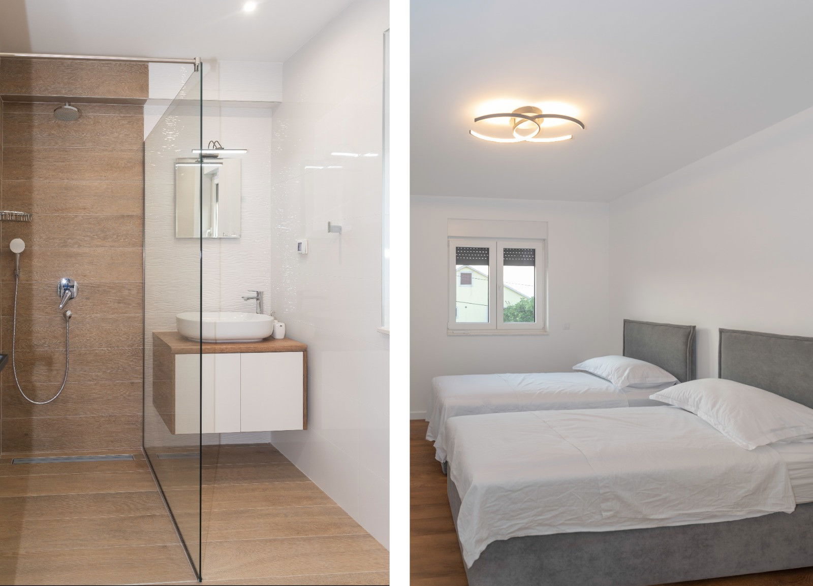 Villa Aria was renovated in 2024 in a contemporary and modern style, and offers you 147 m2 of living space. It is 7 km from the nearest beach where you can explore the depths of the sea and swim in the Adriatic Sea. It is fully air-conditioned and offers accommodation for a maximum of 6 people. You will sleep in 3 bedrooms, two of which have a double bed, and the third bedroom contains 2 single beds. There are 3 bathrooms: 2 en suite and one regular with a shower. As additional facilities, a washing machine, a dryer, and an iron are available. The living room is equipped with a sofa and a TV, and next to it there is a dining room with a dining table with 6 seats. The kitchen is equipped with everything you need to prepare delicious meals for family or friends.